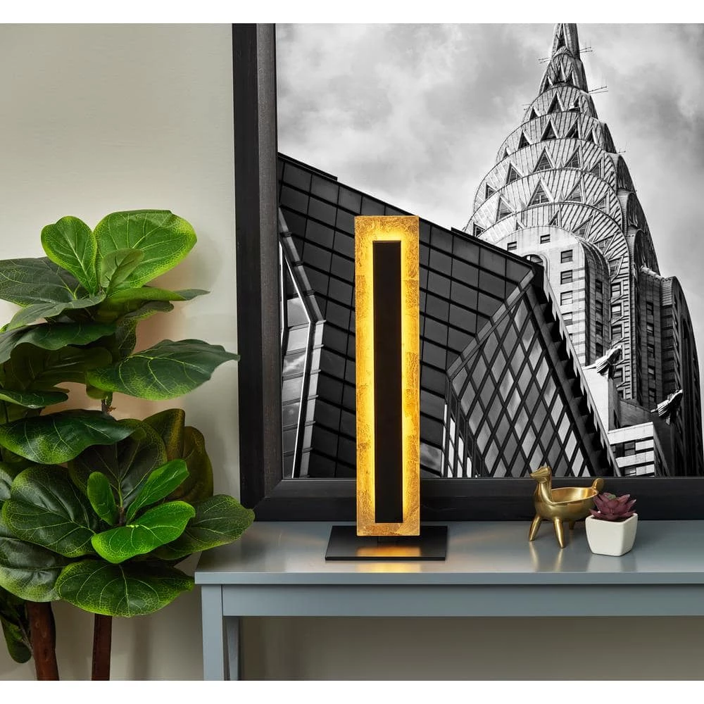 Bring a warm artistic glow to your space with the Hayden LED table lamp. Its rectangular architecture along with a black metal and distinctive gold foil finish create a striking and dramatic look. The 16.75 in. tall and 6 in. W lamp features a black metal rectangular body with 2 integrated 5-Watt LED lights. Softly distilling the 800 Lumens is a large rectangular gold foil diffuser that offsets the black metal finish. Operated by a 3-step touch dimmer switch discretely positioned on the back, the brightness can easily be set to high, medium, low or off to suit your needs. The lamp rests upon a low-profile, 6 square metal base with black finish. Complete your space’s look with the coordinating Hayden floor lamp.