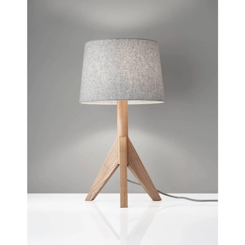 The beauty of the Eden Table Lamp lies in the materials. A natural ash wood grain composes the tripod base of this lamp and is offset by a textured grey felt tapered drum shade. This simple and rustic design is finished off with a black and white fabric covered cord.