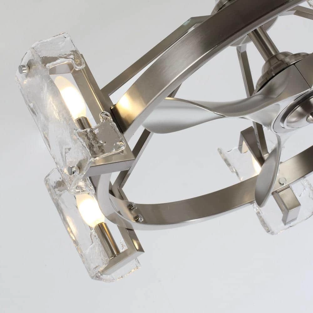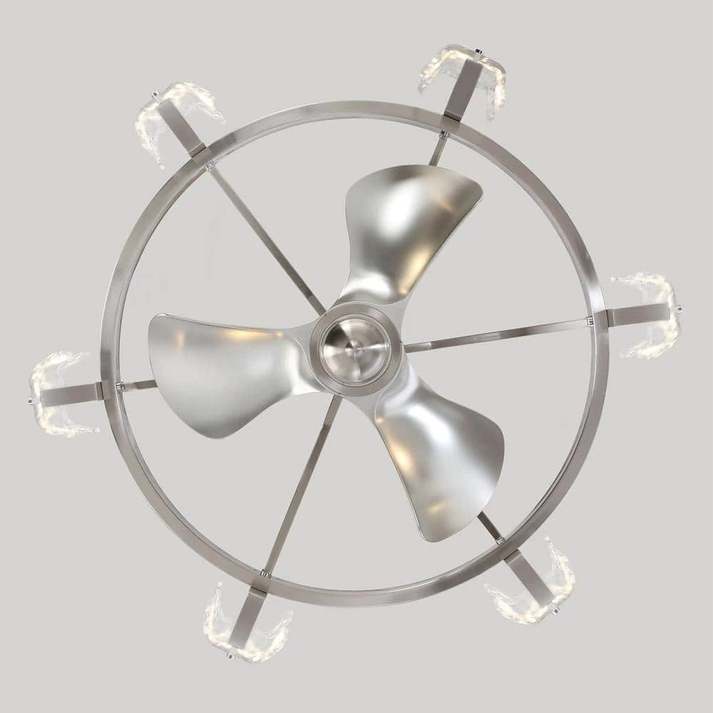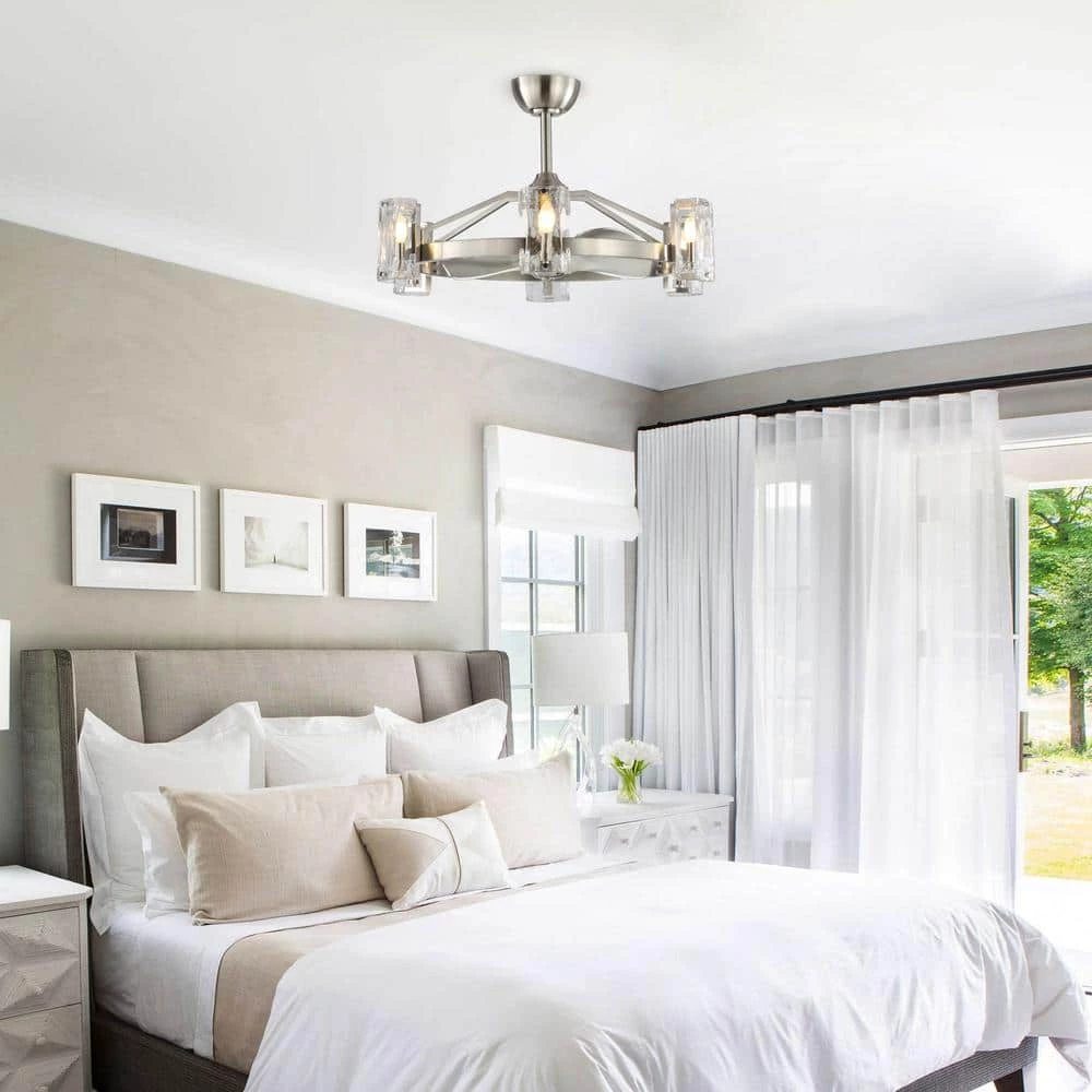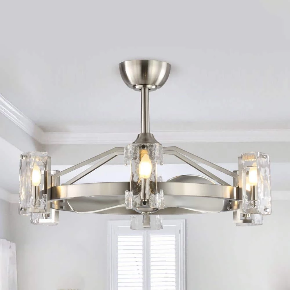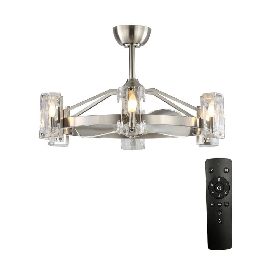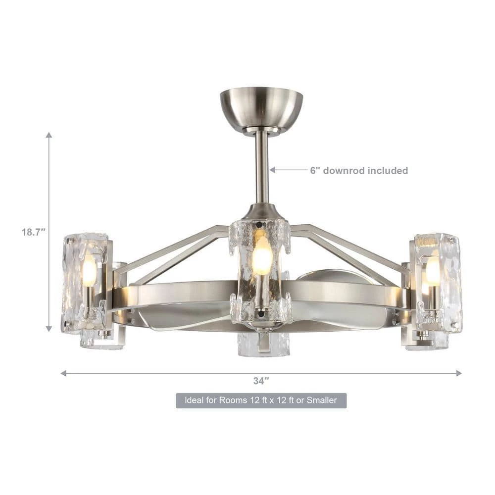 This decorative and functional chandelier and ceiling fan combination with 3 blades, light and remote. 6 fan speed gives off a great airflow, required 6-pieces 4 Watt light bulbs. Timing function allows you are able to choose the working time. With its delicate handcraft and glamorous appearance, this Satin Nickel 3 blade ceiling fan with remote is surely a statement piece for your kitchen, dining room, living room, bedroom or foyer.