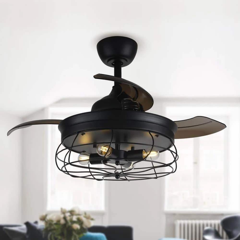 It is a combination of an industrial caged down rod mount and a retractable ceiling fan. When switched off, the intrusive fan blades automatically retract and conceal and visually the unit transforms into a slim, industrial caged light kit. Remote control, timing available.