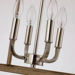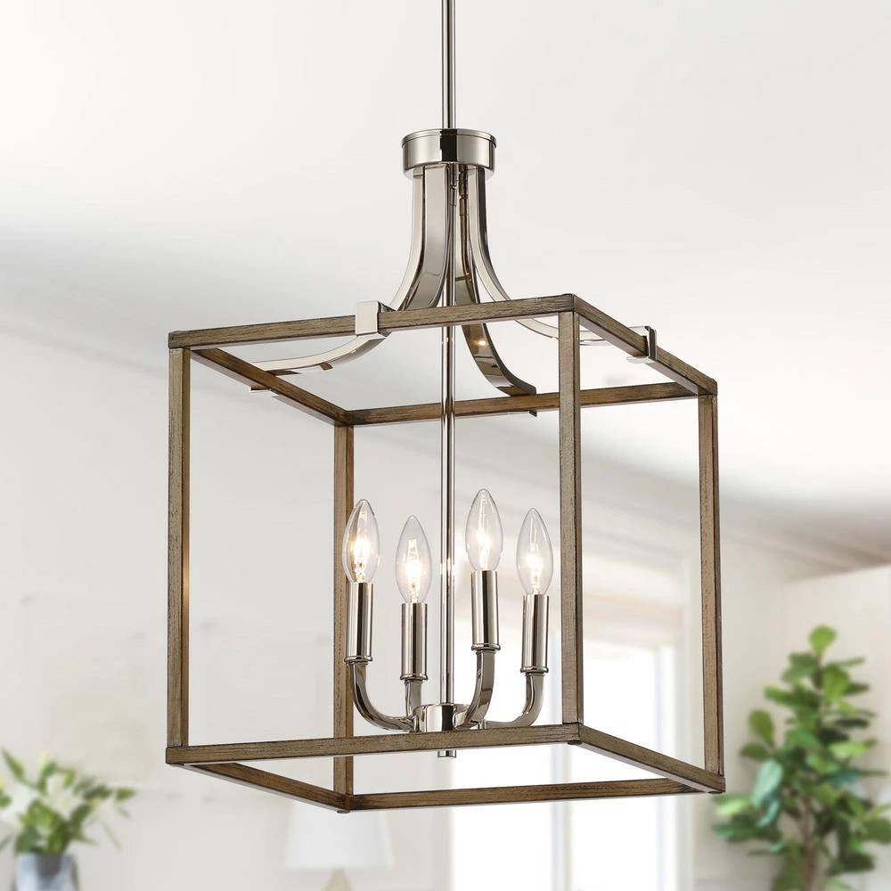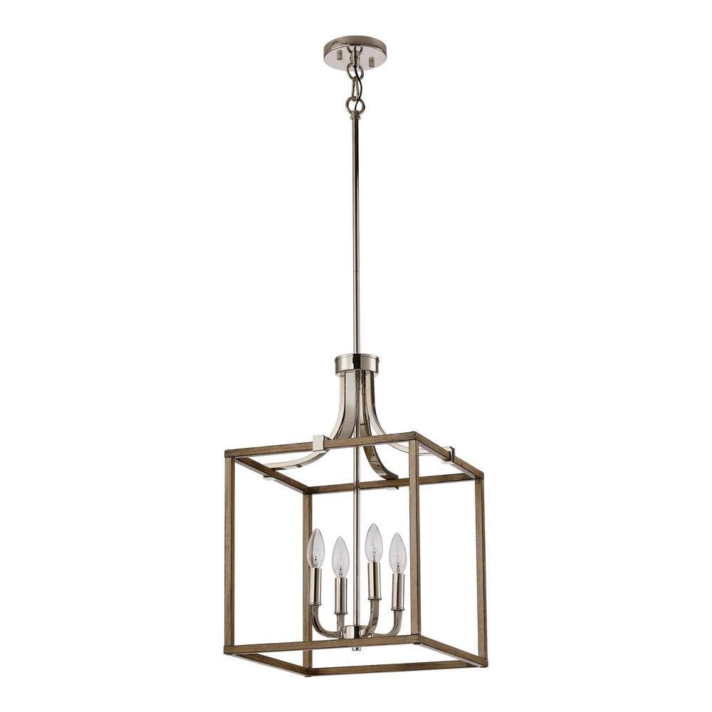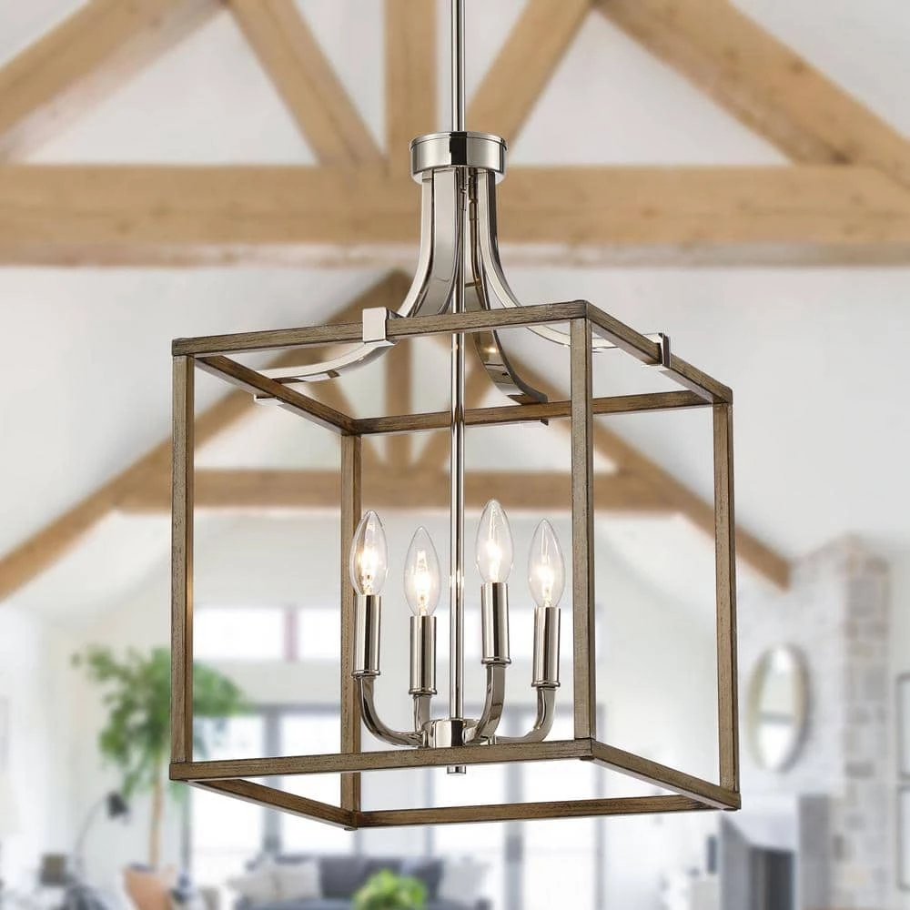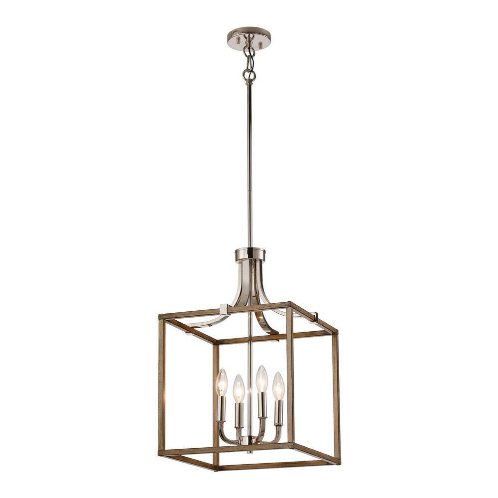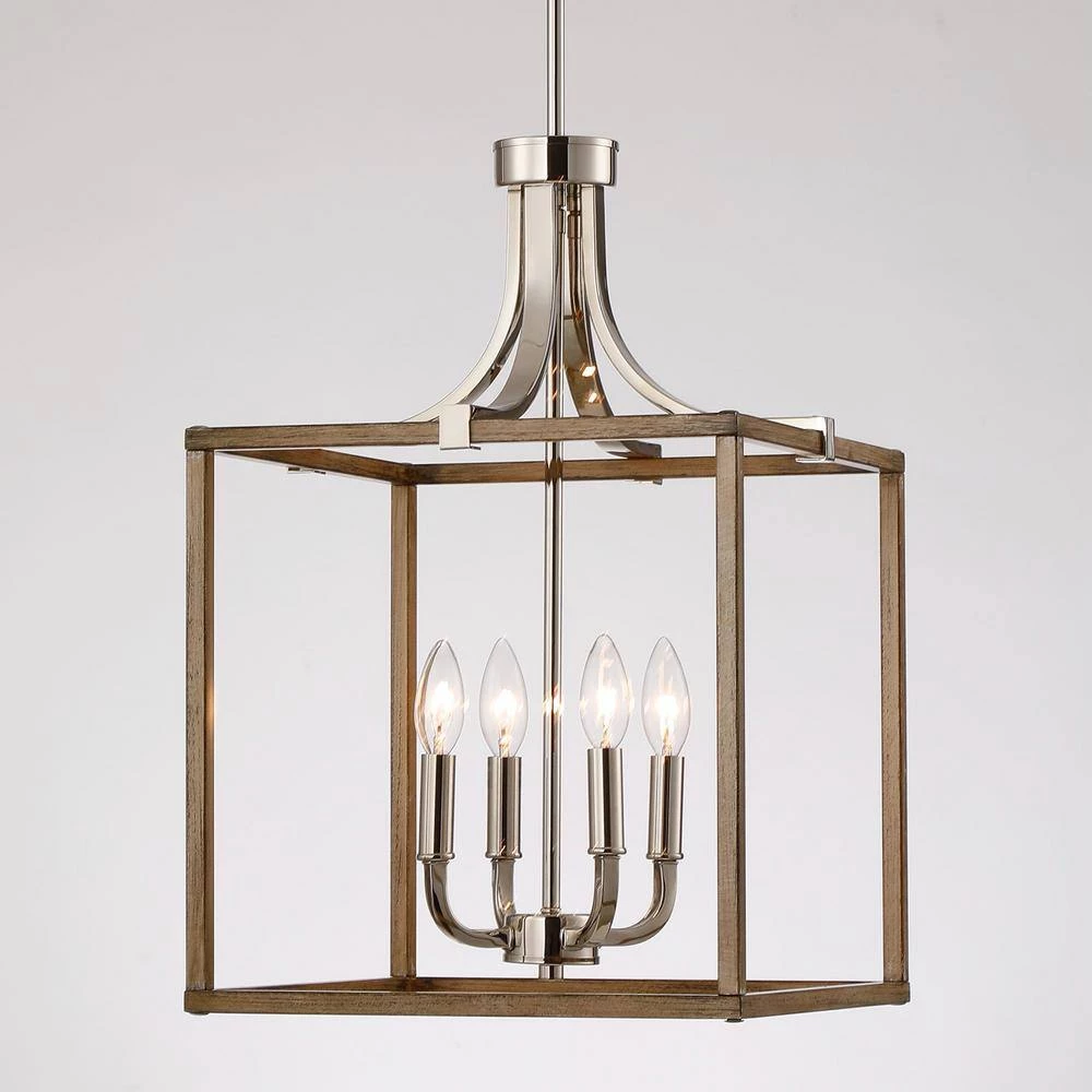 Enhance your entryway kitchen or dining room with the classic styling of this 4-light chandelier. Highlighted by a contemporary metal birdcage design inbrushed wood finish and polished nickel bracket, adds a warm glow to a variety of indoor spaces. The open caged shade exposes the candelabra style bulbs for a classic look perfect for providing ample task lighting.