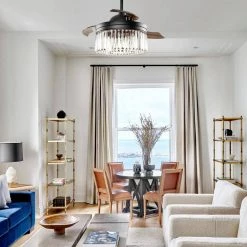 The 3-blades LED crystal chandelier ceiling fan with light, fan speed and light can be controlled separately by remote control. Provided with both functions of traditional lamps and fans. That makes it very convenient for you to use in the living room, bedroom and so on. When you turn on the ceiling fan, the blades will stretch out, while when you turn off the fan, the blades will put inside automatically. Exclusive motor technology and remote system that ensure your fan will remain Quiet for life.