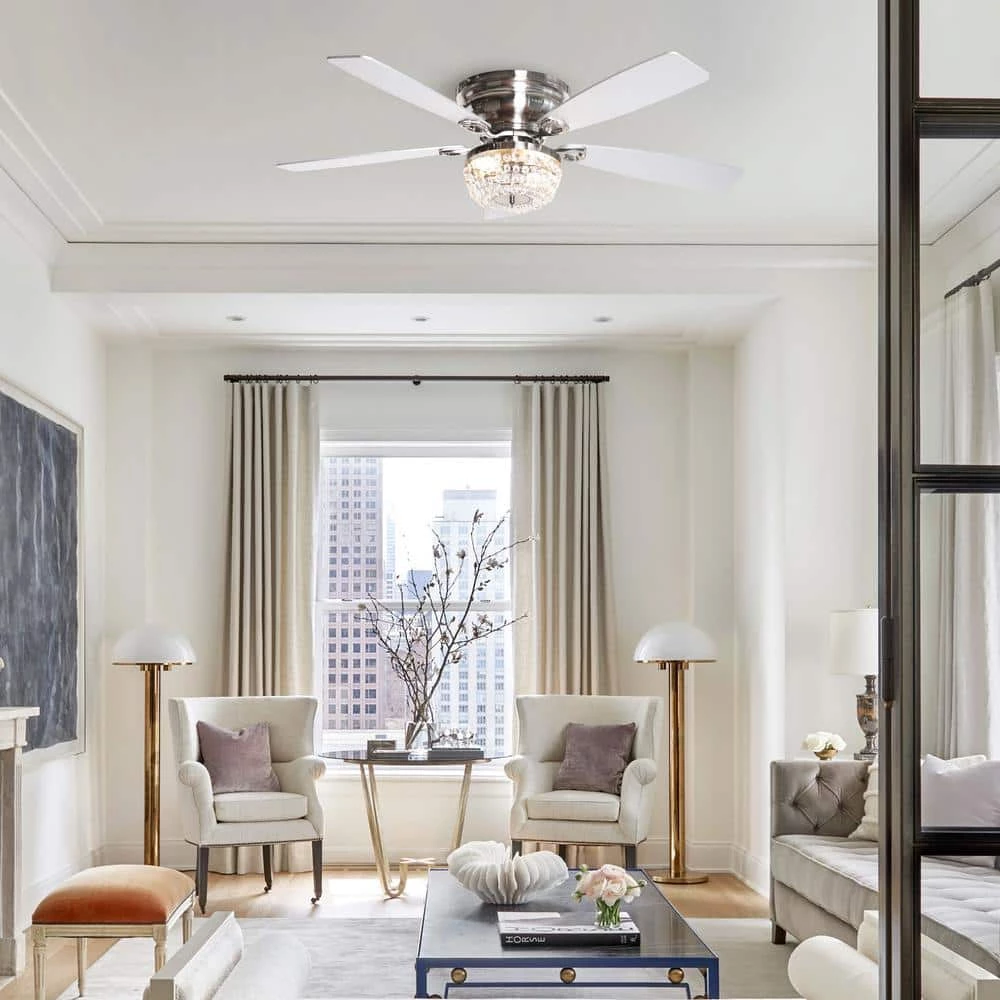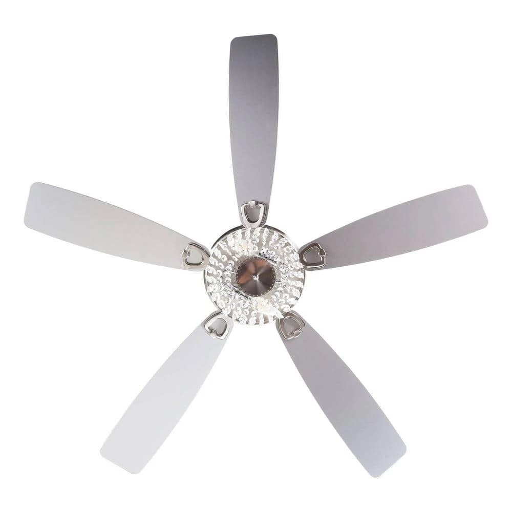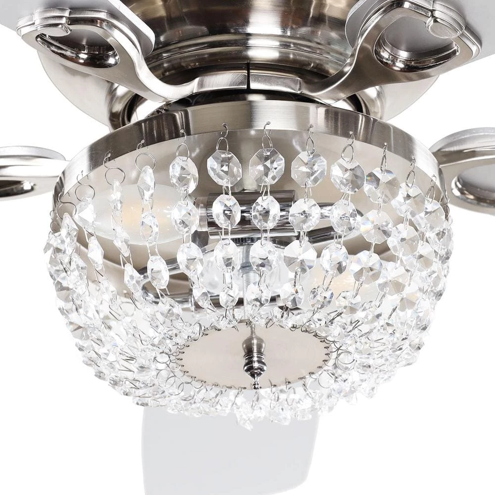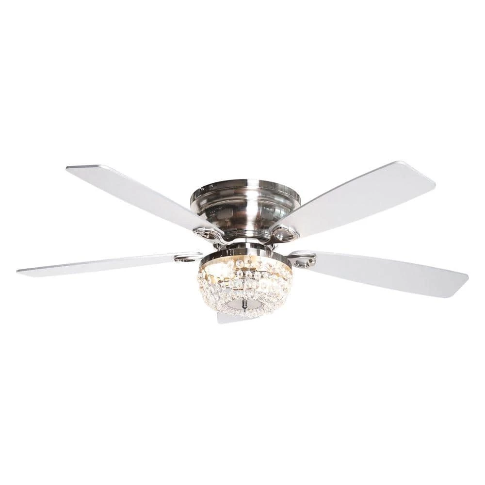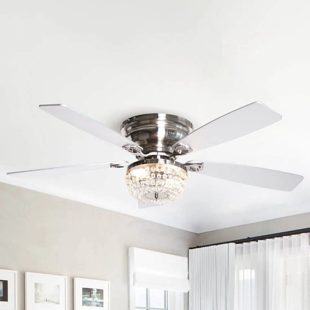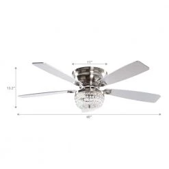 Add ambient lighting and a comfortable breeze to any room with this 48 in. flush-mount ceiling fan. This sleek modern ceiling fan design comes in a nickel finish motor, with five silver finish blades. Included is an elegant light kit made of crystal chain. Includes a hand-held remote control with a turn-on/off light and adjust fan speeds function.