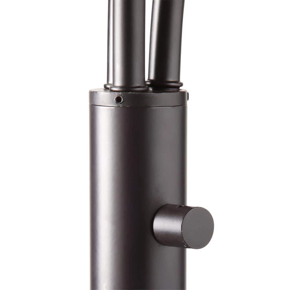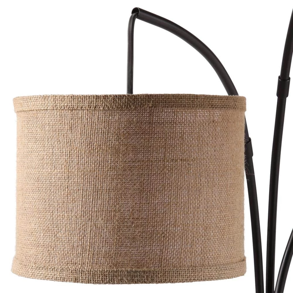 The antique bronze floor lamp has 3 burlap drum shades which suspend from adjustable curved metal poles. It has a rotary switch on pole and uses three 60-Watt incandescent bulbs or CFL equivalent (not included). It is 80 in. H. This lamp would bright up any room decor.