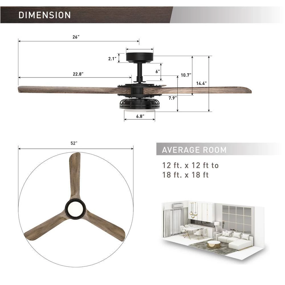 - 52 inch blades are designed for medium sized rooms such as a kitchen, bedroom, living room or dining room