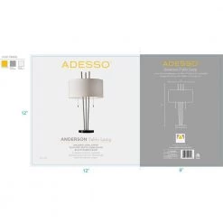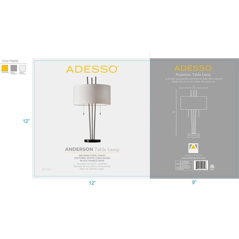 3 brushed steel poles extend through a beautifully textured white fabric shade creating the unique, yet elegant silhouette of the Anderson Table Lamp. A double socket holds two 60-Watt bulbs that can be turned on and off with double pull chain switches. A black marble base adds a decorative accent to the simple style.