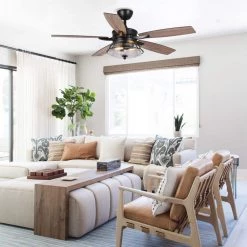 Gorgeous glass work meets flawless vintage woodwork and ironwork in this 1-piece 52 in. ceiling fan. Designed with aged iron and 5 reversible wood blades, featuring a weathered light brown distressed finish. Complemented by a rustic industrial light kit with clear glass shade and 2-light lamps, setting a farmhouse focal mood for any living space.