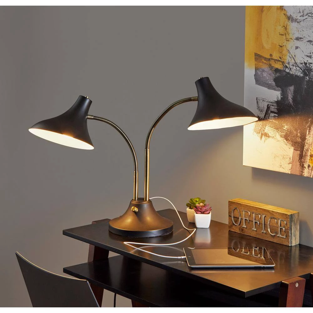 The Ascot Table Lamp mixes style and functionality in the best way. Black and antique brass metal finishes and 2 abstract shaped shades work together to create a classic mid-century modern silhouette. 2 gooseneck arms allow for the light to be directed exactly where it is needed. A simple rotary switch has 4 settings: left light on, right light on, both lights on, off. Charge up your mobile devices using a convenient USB port located on the base.