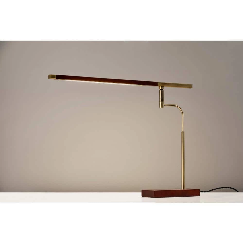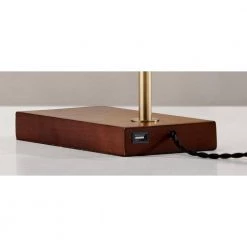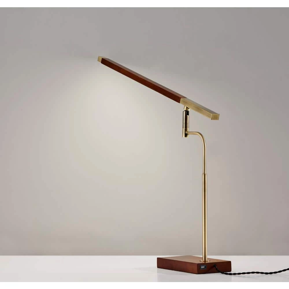 A thin silhouette with a small footprint, the Barrett LED Desk Lamp is perfect for the work space. A long, walnut wood shade that adjusts in all directions allows for light wherever it is needed on the desk. A 3-way touch switch is located on the edge of the shade for easy access. A 2 Amp USB port is located on the back of the base for easy access to charge up smart devices. With a walnut wood finish with antique brass accents, this desk lamp is as stylish as it is functional. A twisty black fabric cord comes neatly out of the back of the base. This desk lamp is not smart outlet compatible.