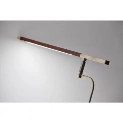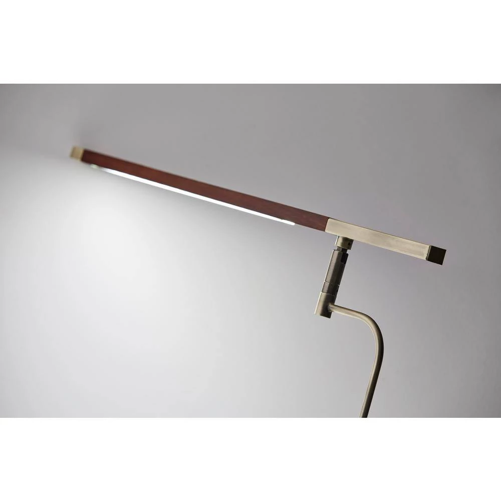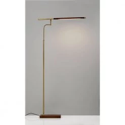 A thin silhouette with a small footprint, the Barrett LED Floor Lamp is perfect for the work space or reading area. A long, walnut wood shade that adjusts in all directions allows for light wherever it is needed on the desk. A 3-way touch switch is located on the edge of the shade for easy access. With a walnut wood finish with antique brass accents, this desk lamp is as stylish as it is functional. A twisty black fabric cord comes neatly out of the back of the base. This floor lamp is not smart outlet compatible. The LED bulb is integrated into the lamp and is not replaceable, but lasts 50,000-hours.