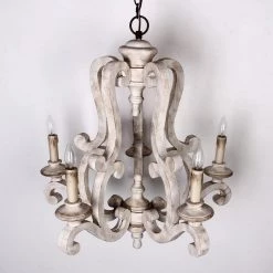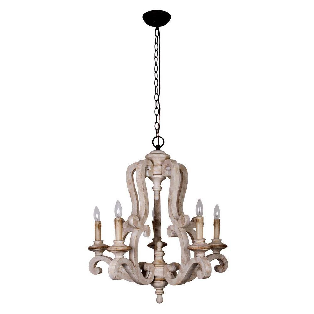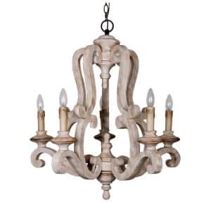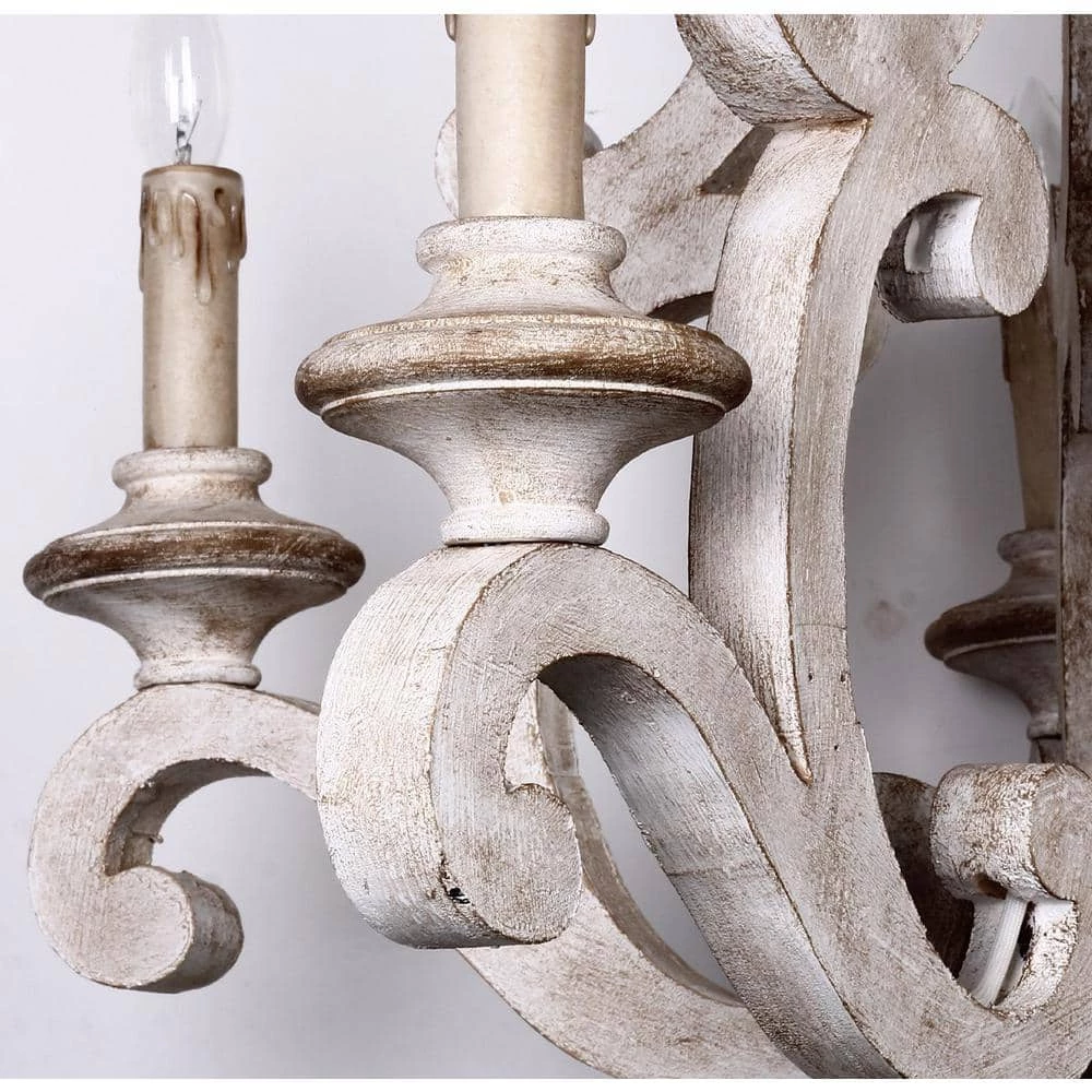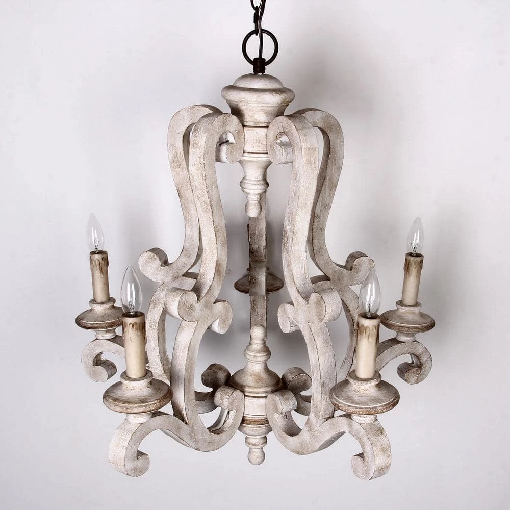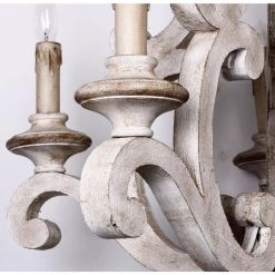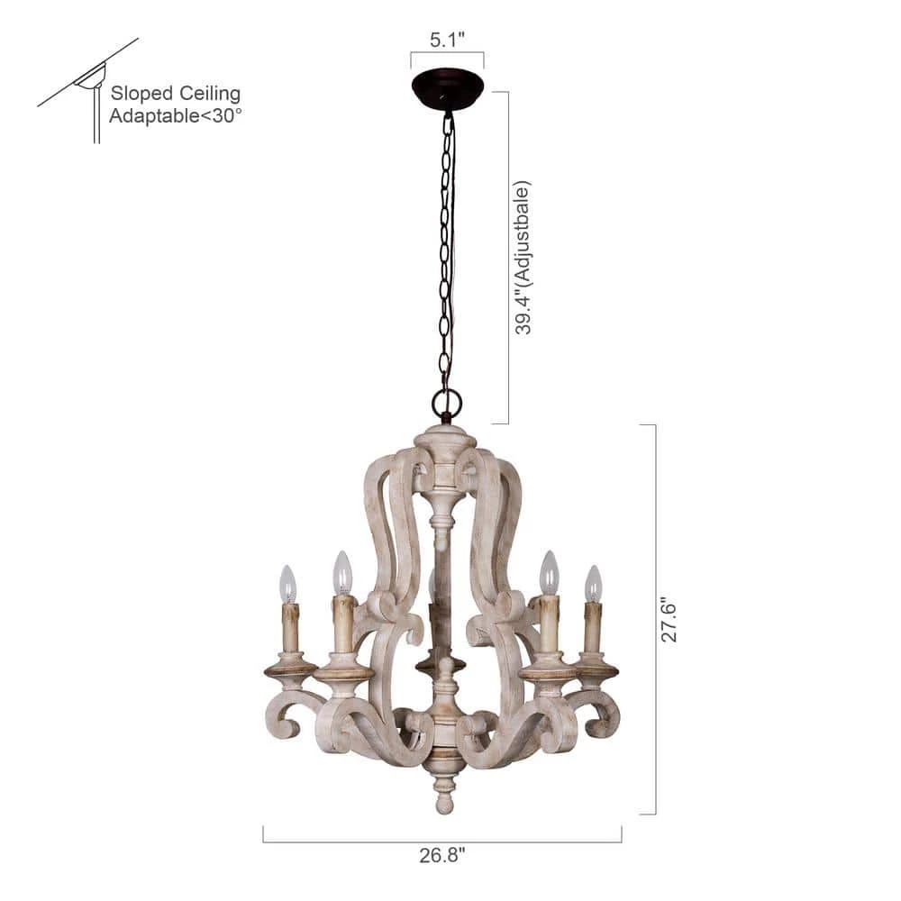 Antique 5-Light Wooden Candle Chandelier, Distressed White. Features a whole wood construction with a special handmade craft technology and distressed white finish, this 5-light farmhouse chandelier surely brings you an antique visual experience. Based on the traditional lighting from the French palace, the chandelier appearance is modified in detail to cater the contemporary aesthetics without losing its unique characteristics. Including candlestick bases with 5 E12 lights (bulbs not included), it can satisfy your lighting requirements while bringing you a beautiful and soft enjoyment.