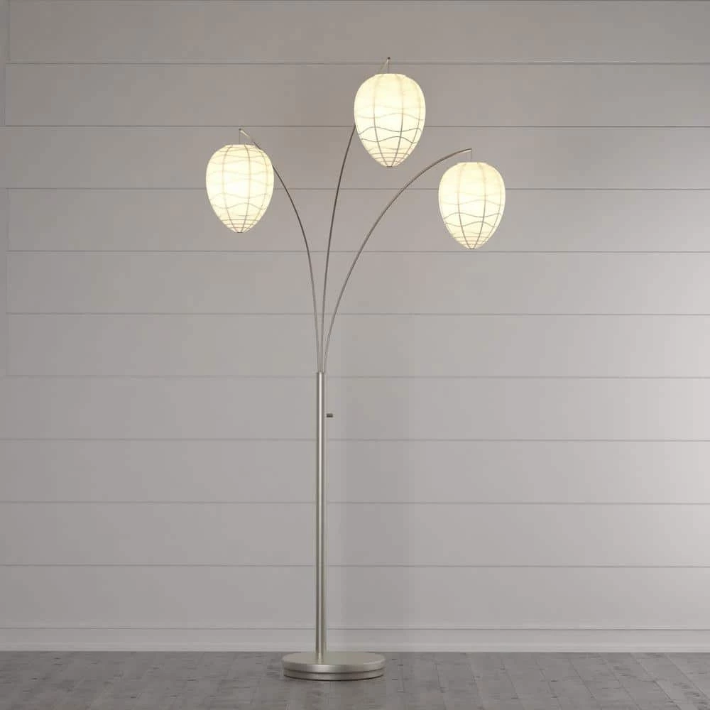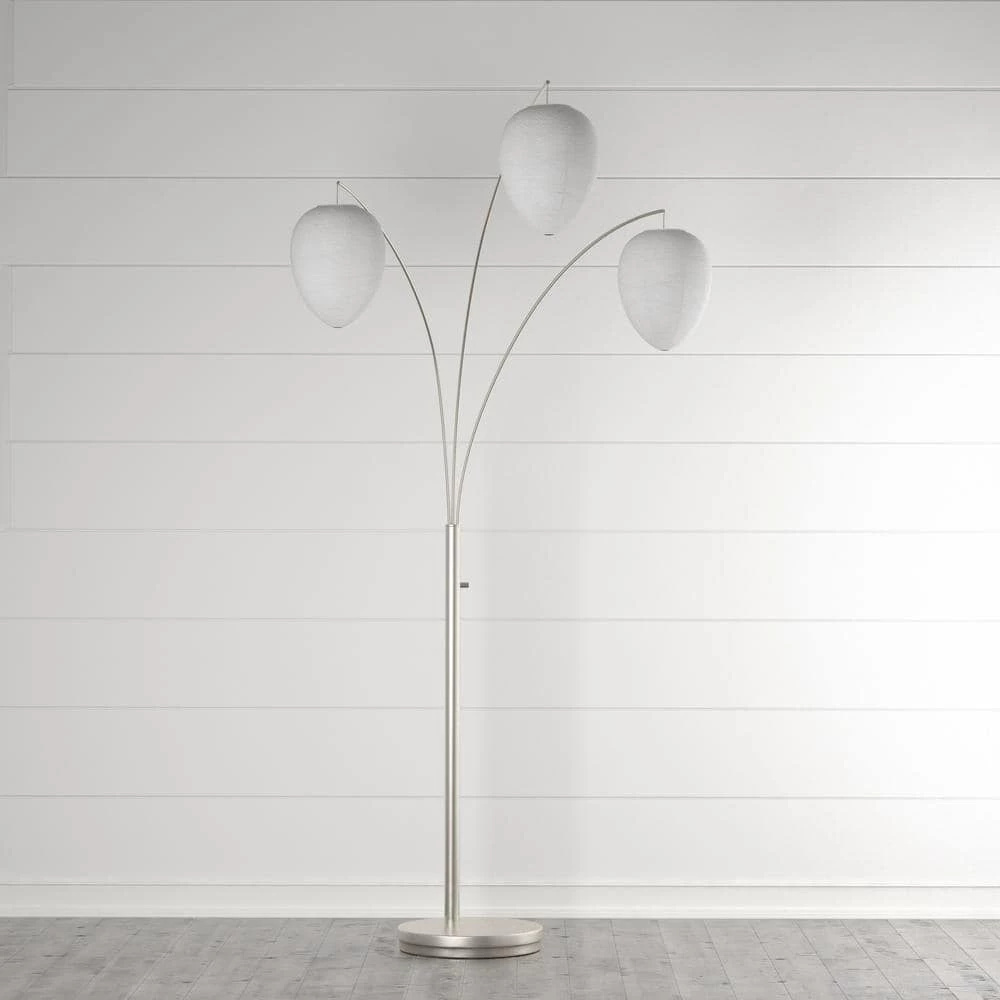 Modern, light, and airy, the Bella Arc Lamp is teeming with style. The white paper lanterns are shaped like a beehive and are suspended from curved chrome finished poles. The sturdy base is made of satin steel and has an on/off switch. 82 in. Assembled dimensions: 46 in. D x 82 in.