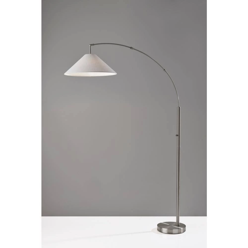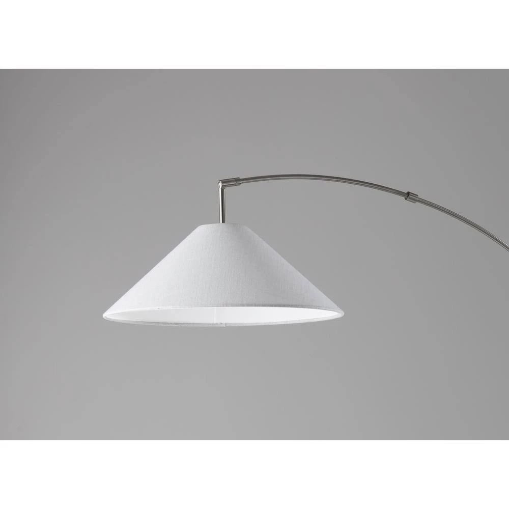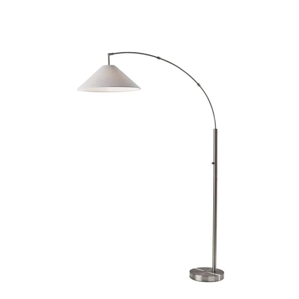 Add a modern touch to your space with the clean styling of the Braxton Arc floor lamp. The arcing design of this 76 in. tall lamp makes it the perfect light source for reading in a recliner or working at a desk, while its slender design makes it easy to position near love seats, couches, armchairs or side tables. for even greater versatility, the lamp’s head features an adjustable joint, allowing you to direct the 100-Watt bulb (not included) wherever it’s needed. The 11 in. Dia round brushed steel base provides stability, while the clean lines in brushed steel add a modern, minimalist touch. The brushed steel finish continues through the pole and arcing stem. Topping off the lamp is a shade made of textured white fabric that features a contemporary cone shape. Operated by a rotary switch located on the stem to easily turn it on or off, the lamp also includes a 5 ft. black cord. The Braxton Arc floor lamp is also available with a dark bronze finish and coordinating light brown textured fabric shade.