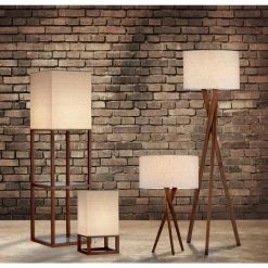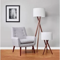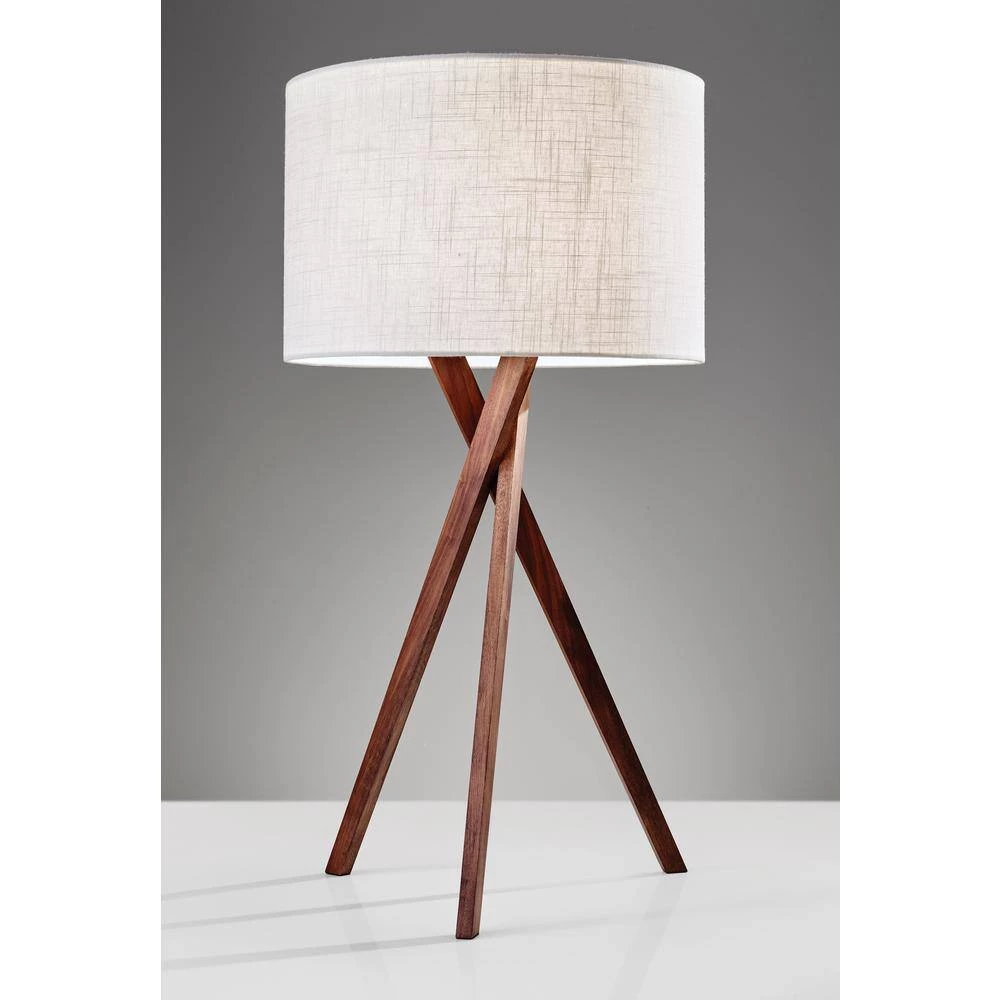 A sleek light walnut tripod base suits a variety of settings from contemporary, masculine, transitional to loft style. The legs attach to a metal disc that supports the socket and white textured linen shade. Overall height is 25 in. and the tripod base has an 8.5 in. footprint.