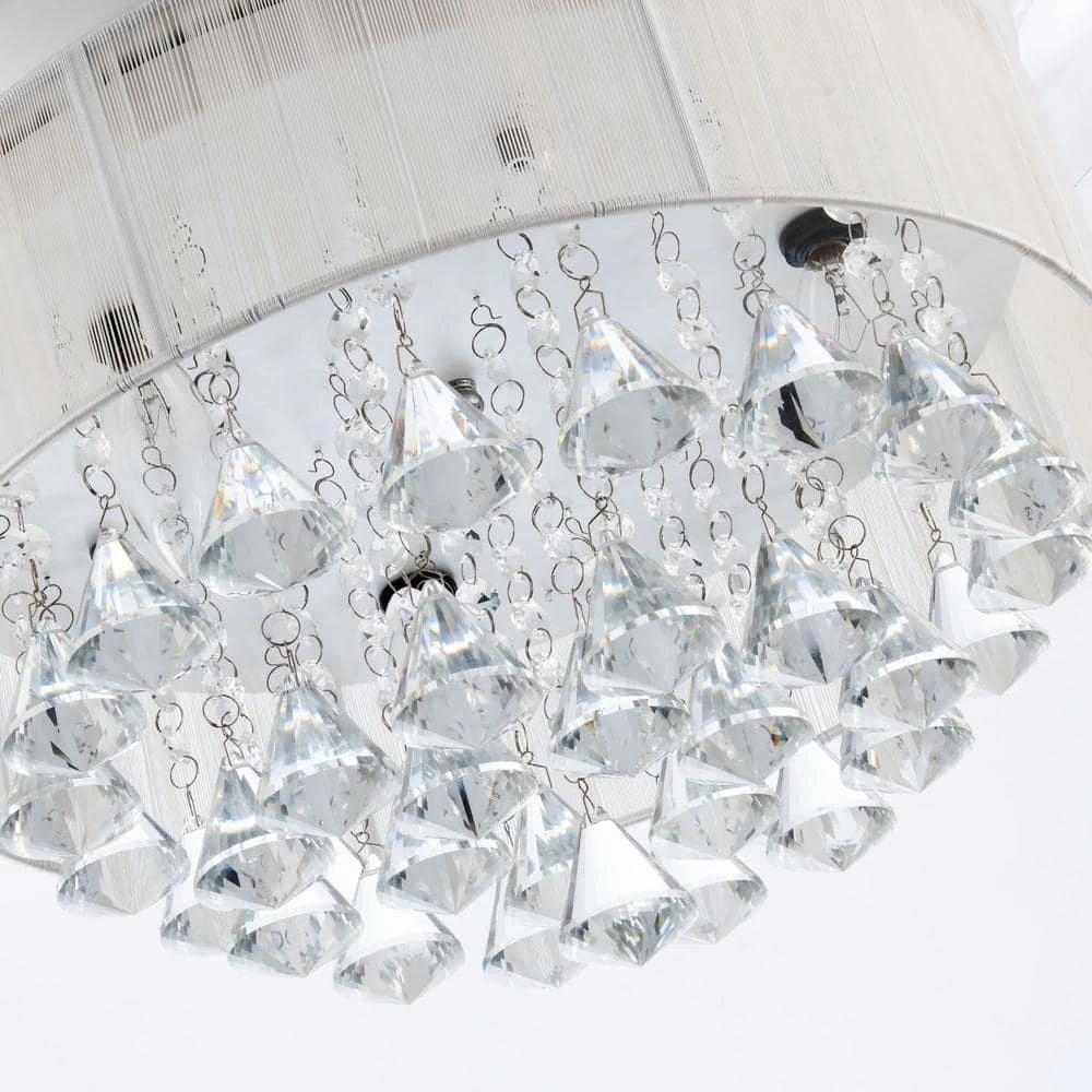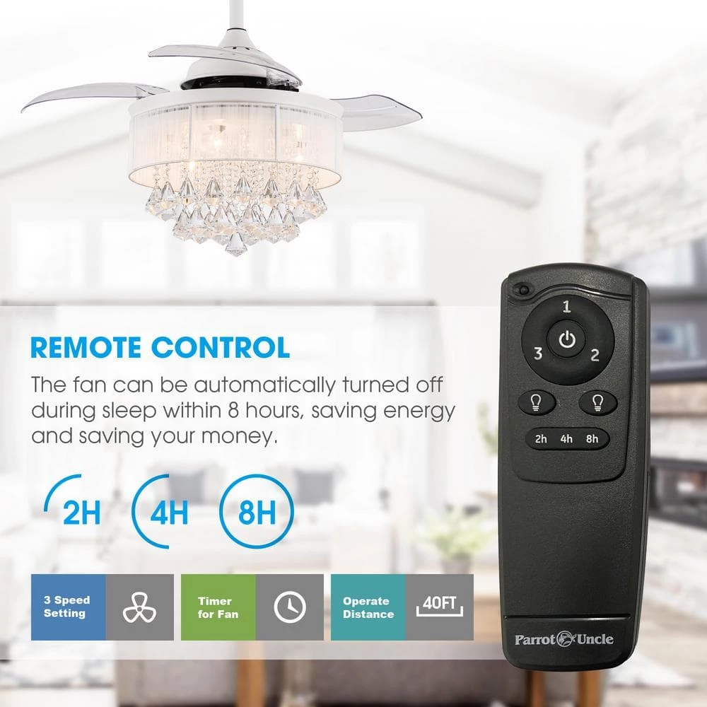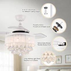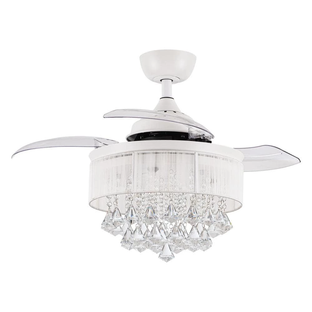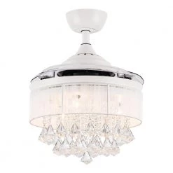 This 36 in. fancy ceiling fan provides with both functions of traditional lamps and fan. The white fabric lamp shade with decorative clear crystals provides bright illumination, while the fan features the retractable blades, it can expand and shrink automatically according to the switch. Motor technology and remote systems keep your fan quiet and easy use, ideal for you to use in the living room, bedroom and anywhere else.
