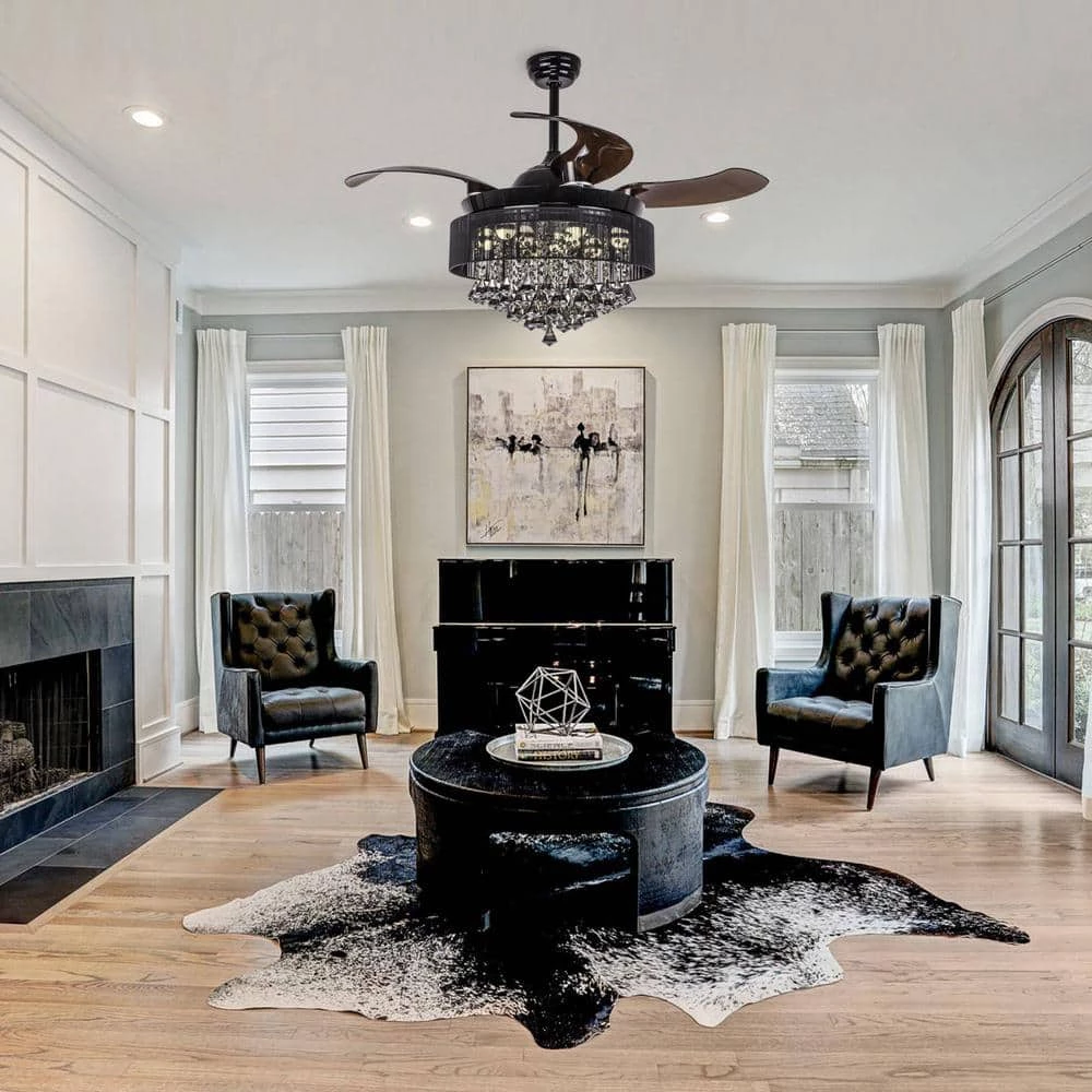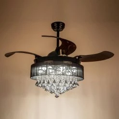 The 4-blades LED crystal chandelier ceiling fan with light, fan speed and light can be controlled separately by remote control. Provided with both functions of traditional lamps and fans. That makes it very convenient for you to use in the living room, bedroom and so on. When you turn on the ceiling fan, the blades will stretch out, while when you turn off the fan, the blades will put inside automatically. Exclusive motor technology and remote system that ensure your fan will remain Quiet for life.