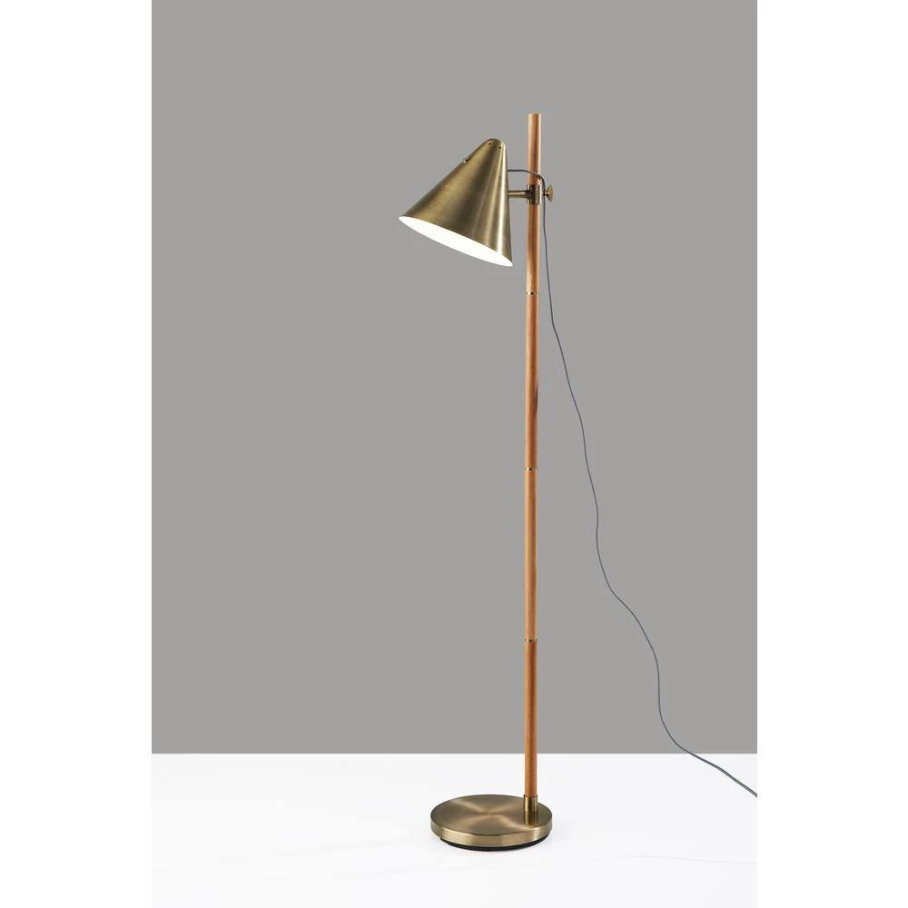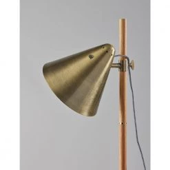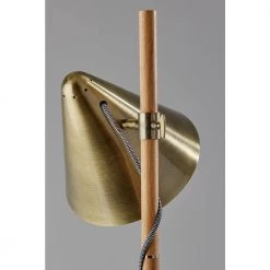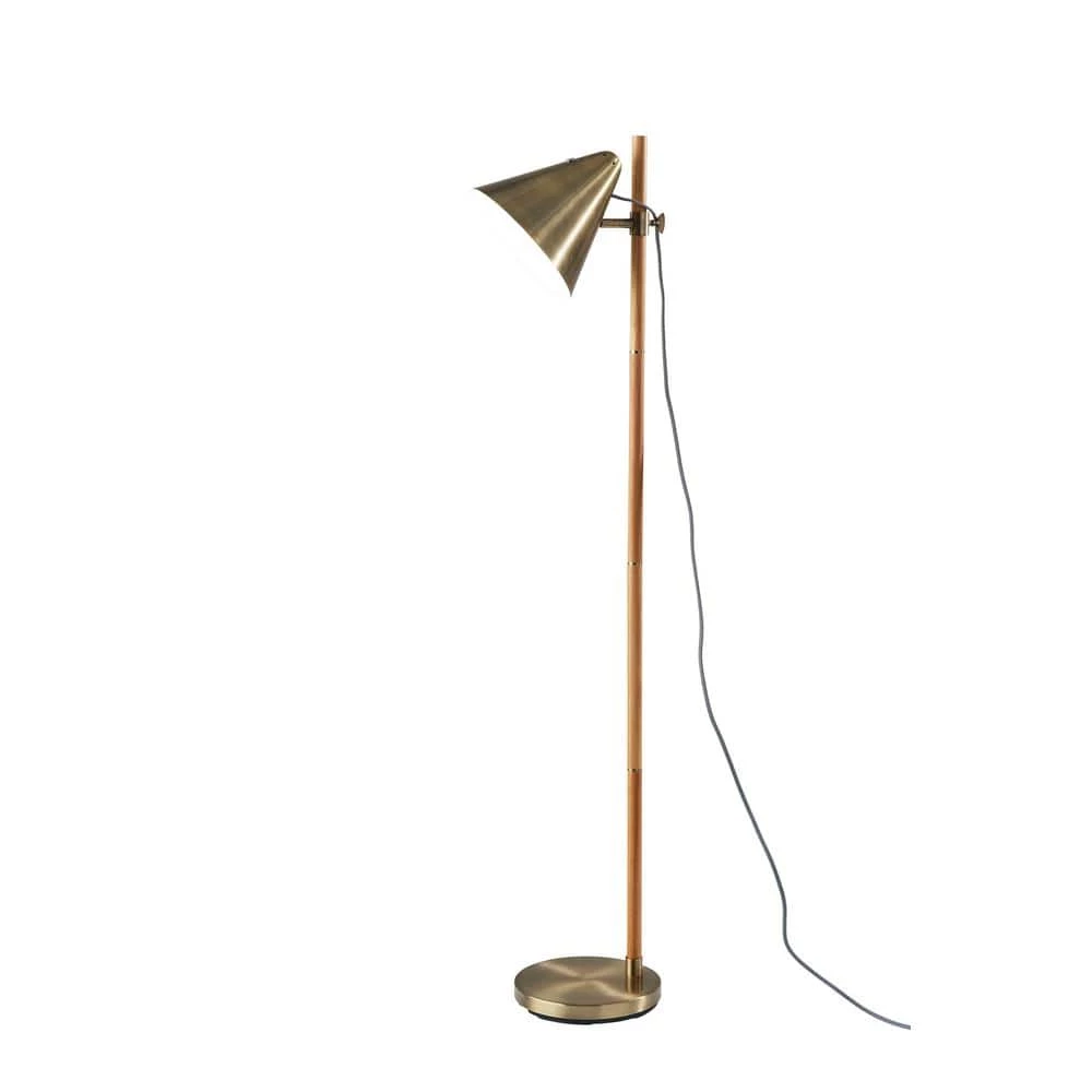 The clean, retro design of the 58 in. tall Bryn floor lamp brings a sense of vintage chic to any space. The round base with an antique brass finish, matching metal cone-shaped head and contrasting natural rubberwood stand highlight the antique look to bring a stylish energy that is perfect for a home office, living room and more. The shade adjusts up and down the pole to set the desired shade height for the task at hand. Operated by a touch switch located on the metal shade to easily turn it on or off, the Bryn floor lamp powers a 60-Watt Type A bulb (not included) for an ideal level of brightness and features a 10 ft. black and white fabric-covered cord. Pair it with the coordinating Bryn desk lamp to complete your decor.