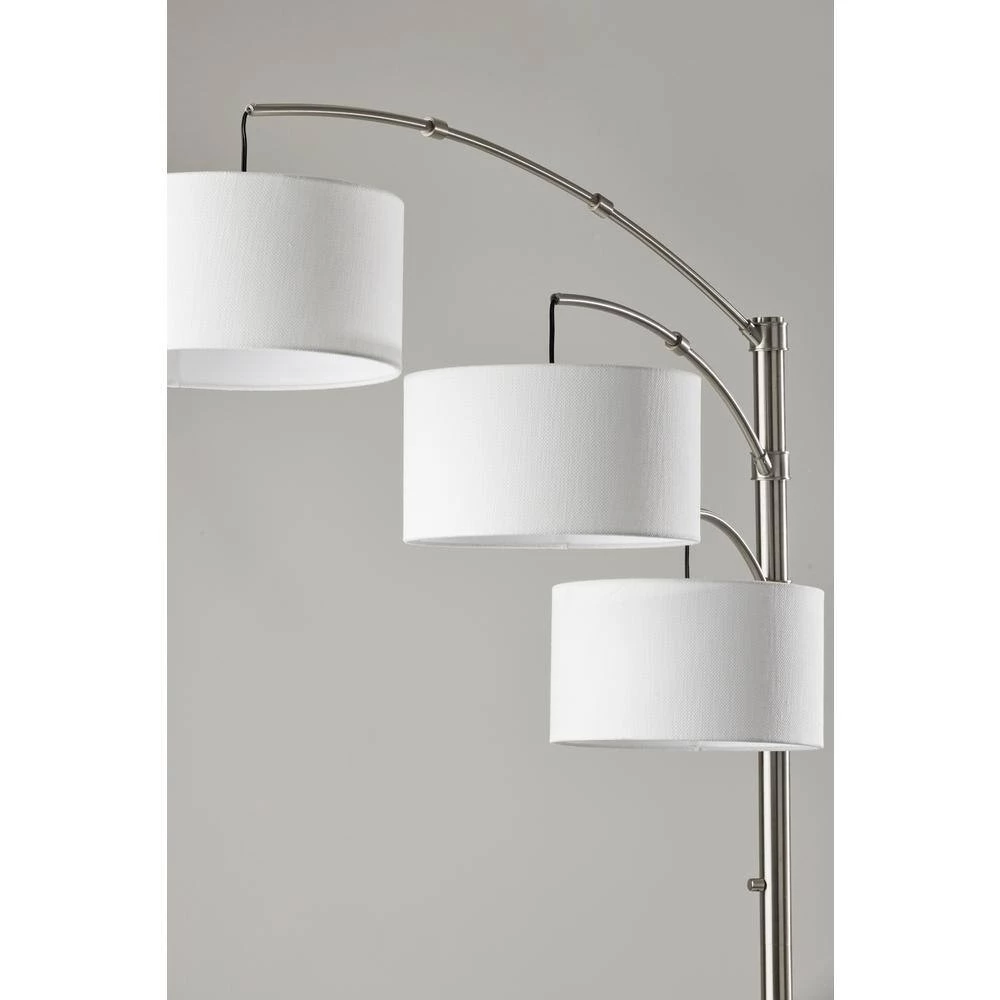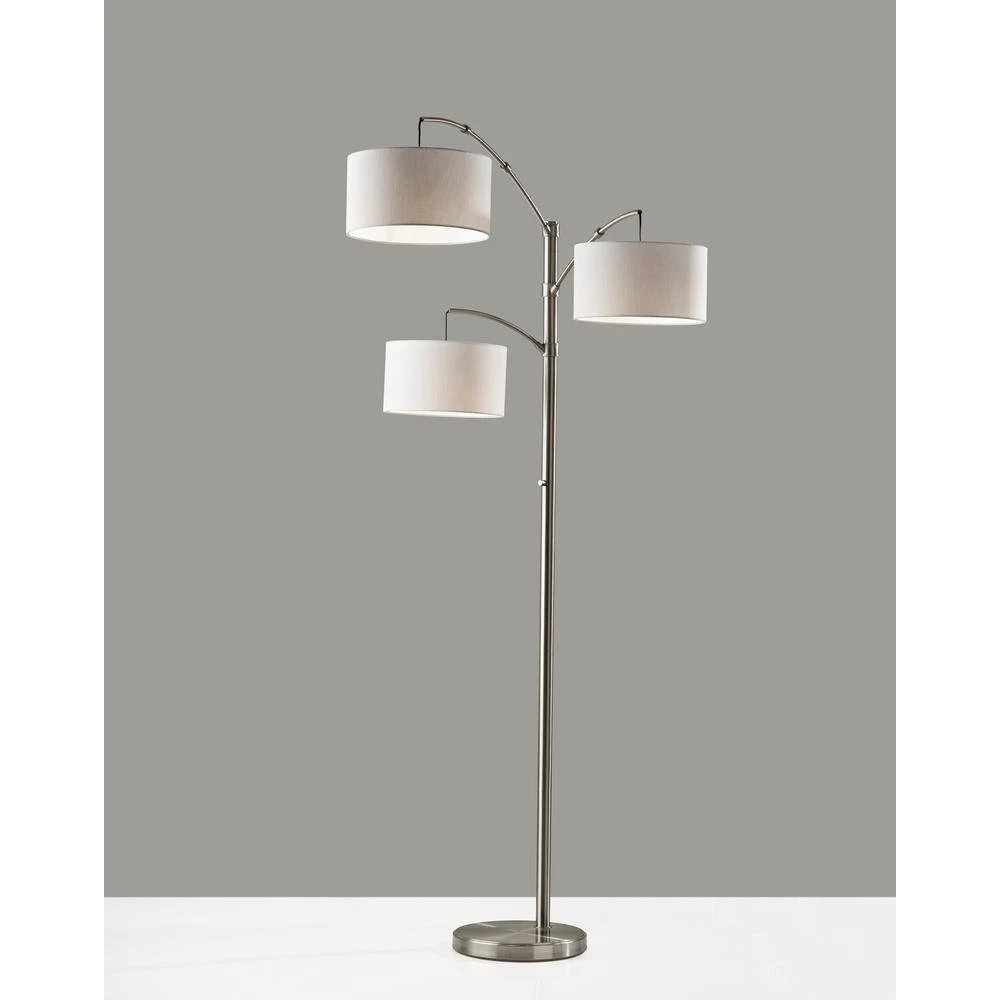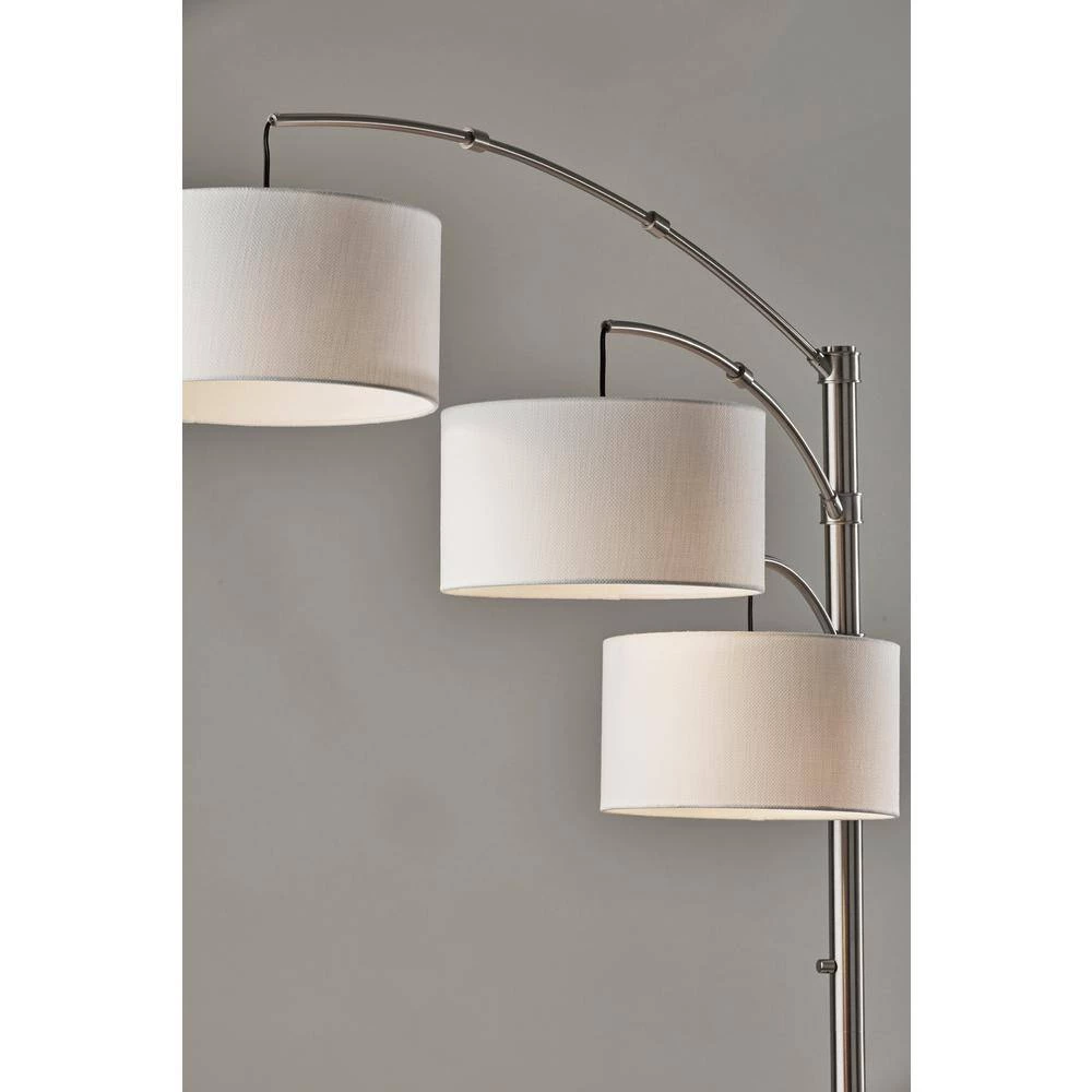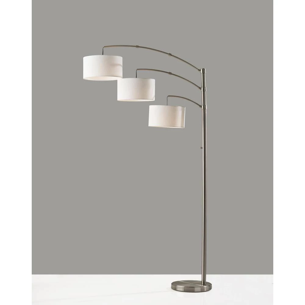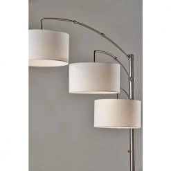 Add an upscale feel to your space with the Cabo Arc floor lamp that effortlessly complements urban, industrial or mid-century modern decor. The clean lines and long arms of this 82 in. tall lamp makes it the perfect light source for reading in a recliner or working at a desk, while its slender design makes it easy to position near love seats, couches or side tables. The 13.75 in. round brushed steel base provides stability, while the clean lines in brushed steel add a modern, minimalist touch. The brushed steel finish continues through the pole and trio of arms. for maximum versatility, the lamp features 3 arms, each topped with a 100-Watt bulb (not included) and textured white fabric drum shade. The arms can all be swiveled and repositioned from the base, allowing you to direct the light wherever it’s needed. Operated by a rotary switch located on the stem, this lamp features multiple lighting settings so you always have the desired amount of light. A simple twist of the switch turns 1-light bulb on, another twist turns 2 of the lightbulbs on, a third twist illuminates all 3 of the lights and a fourth twist turns all lights off. The Cabo Arc floor lamp is also available with a dark bronze finish and coordinating light brown textured fabric shade.