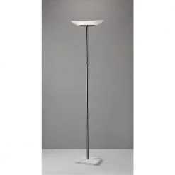 Perfect for a contemporary styled living room, the Celeste LED Torchiere mixes marble, glass and brushed steel to create an elegant, modern design. A rectangular white marble base creates a stunning contrast to a sleek, frosted glass oval shaped shade. A touch dimmer switch is located under the shade.