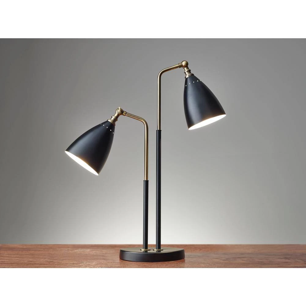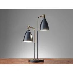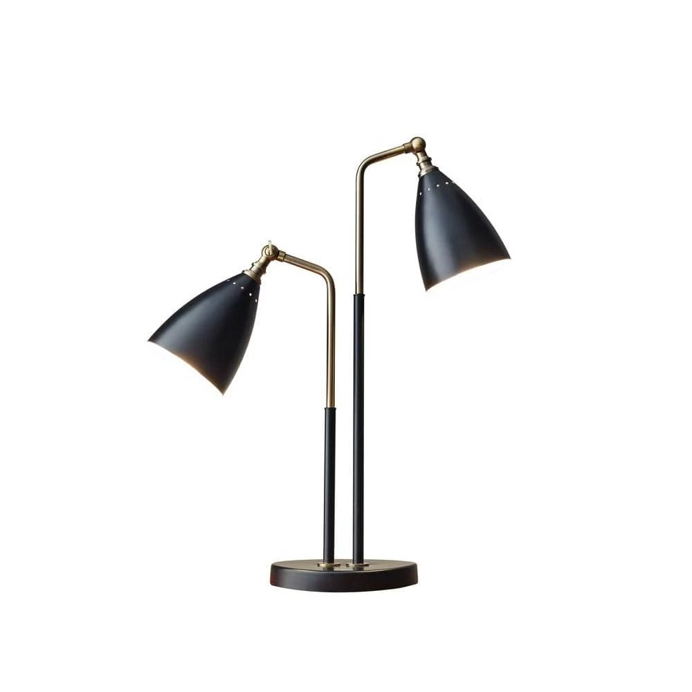 The two-light Chelsea table lamp captures the mid-century spirit with the adjustable, vented matte black metal cone shades in asymmetric heights. Each antique brass angled arm is fitted into a black pole that forms the body. The shades are adjustable up and down with a keyed sprocket.