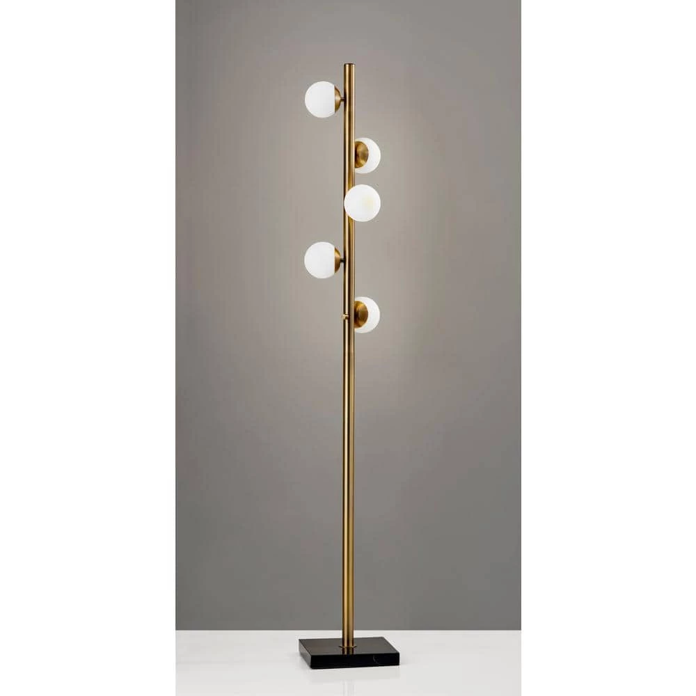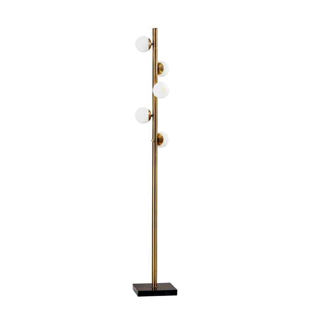 The Doppler LED Tree Lamp has mid-century modern inspiration. Five white opal glass globe shades are scattered along an antique brass pole. A square black marble base serves as a decorative accent as well as a heavy weight to keep this lamp sturdy and safe. This floor lamp ships with five G9 replaceable LED bulbs that give off a total of 1,000-lumens of warm, ambient lighting. The sleek look is finished off with a black fabric covered cord.