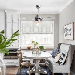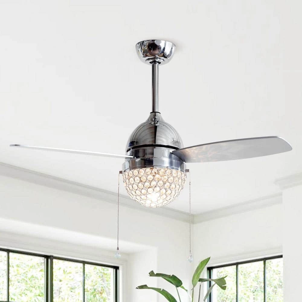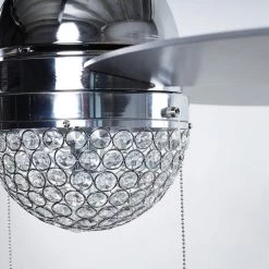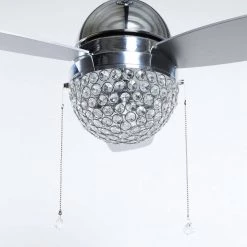 The Dreyer 42 in. crystal ceiling fan offers a morden feel to your home with its chrome finish and shiny crystal shade. The whiper motor features 3 speeds with an integral reverse function. The pull chain controls the speed of the fan and control the light on/off.