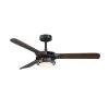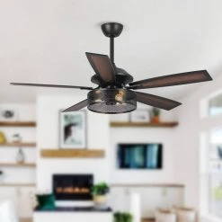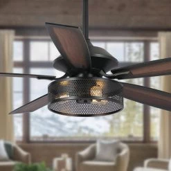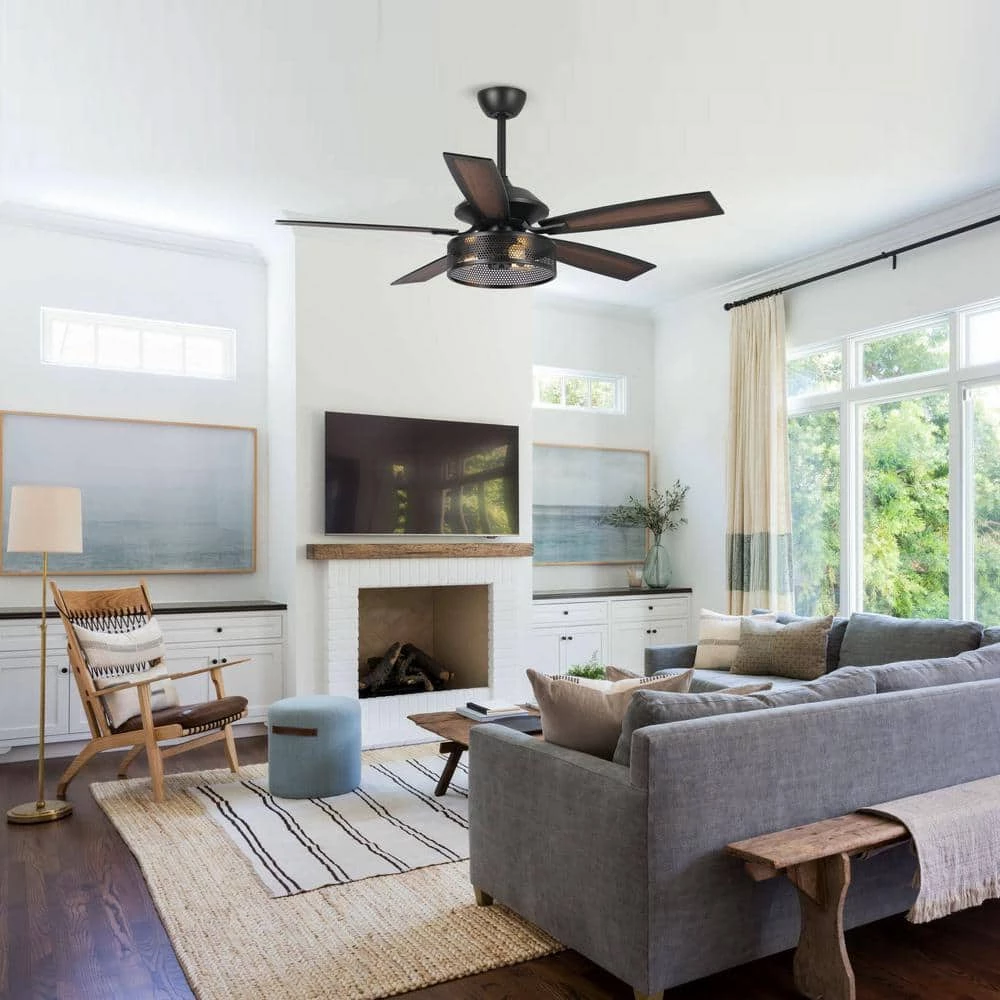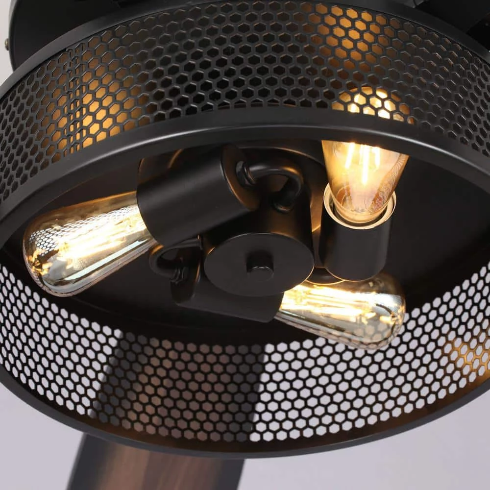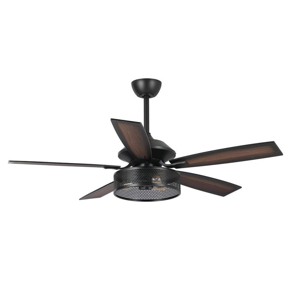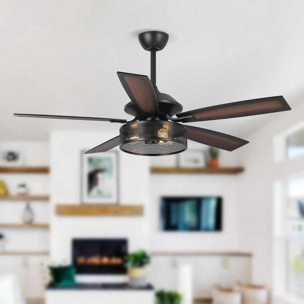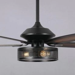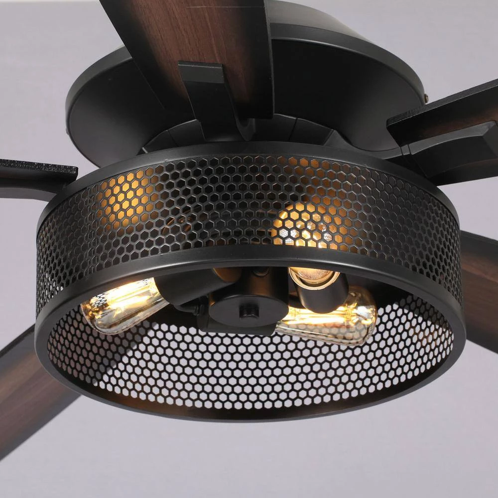 This 52 in. matte black ceiling fan sports 5 blades combined with dark walnut and black finish, add a luxurious aesthetic. The 59-Watt motor has 3-speed settings controlled via a remote controller to let you dial in the airflow. The light kit requires 3-pieces E26 base bulbs for quick setup, maximum in 25-Watt. And the black drum mesh shade has an open bottom and pierced, honeycomb sides for a touch of extra industrial appeals.