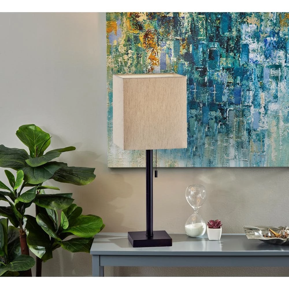 With a clean, stylish silhouette and color palette, the 24 in. tall Estelle table lamp is the ideal complement to any decor. The lamp features a square light brown textured fabric shade that aesthetically balances the square metal base with its antique bronze finish. For convenient access to power, the base includes an AC outlet located at the back. Whether the lamp is turned on or off, the AC outlet will keep working normally. Operated by a metal pull chain switch, the Estelle table lamp powers a 60-Watt bulb (not included) and features a 5 ft. black cord. The table lamp is also available in a matte white finish with a taupe fabric shade or a brushed steel finish with a light grey textured fabric shade.