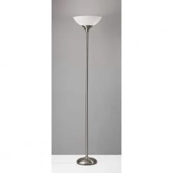 A simple, classic style, the Glenn 300-Watt Floor Lamp is easily placed into a variety of decor and spaces. A brushed steel finished pole extends into a frosted plastic bowl shade that reveals a beautiful glow when lit. An Adesso patented 300-Watt Double Socket construction allows for two crisscrossed sockets, each holding on/off 150-Watt incandescent bulbs or equivalent CFL’s, which provides approximately 3 times more light than a typical torchiere using a 150-Watt 3-way bulb and illuminates an entire room.