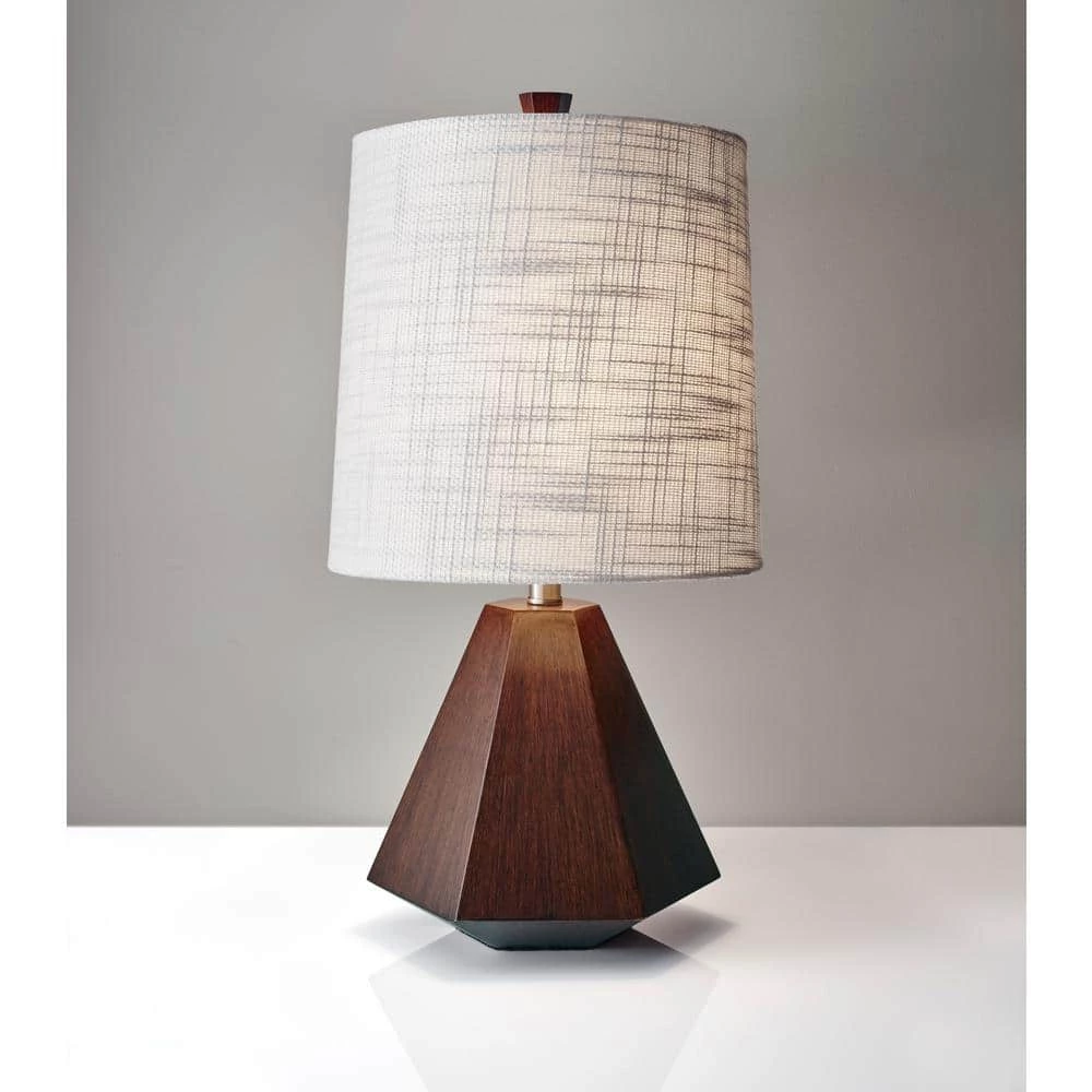 Geometric inspiration is revealed in the unique shape of the Grayson Table Lamp. A combination of sharp edges and a rich walnut wood finish gives this eye-catching design a distinctive style. The look is finished off with a textured, off-white shade. The 3-way rotary socket switch will only work with a 3-way light bulb, otherwise this lamp will function with simple on/off switch at its highest setting.
