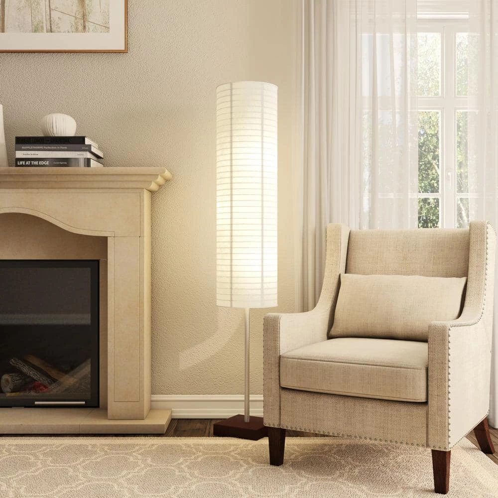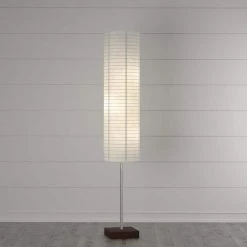 The Adesso Gyoza 67 in. Floor Lamp adds a touch of serenity to your living space with its collapsible rice paper shade and walnut-finished wood base. The lamp uses three 100-Watt bulbs (not included).