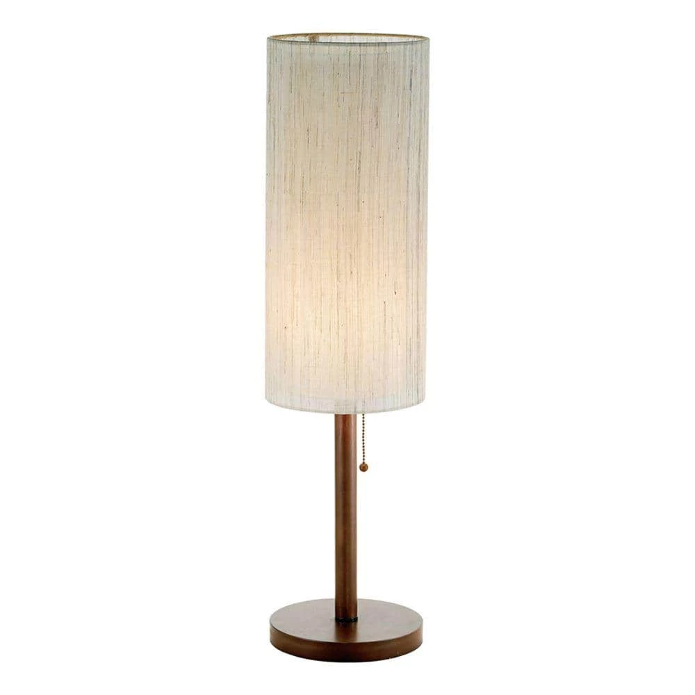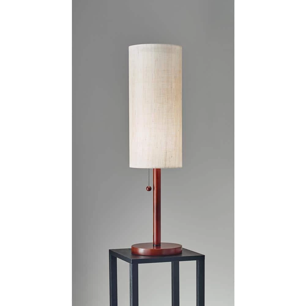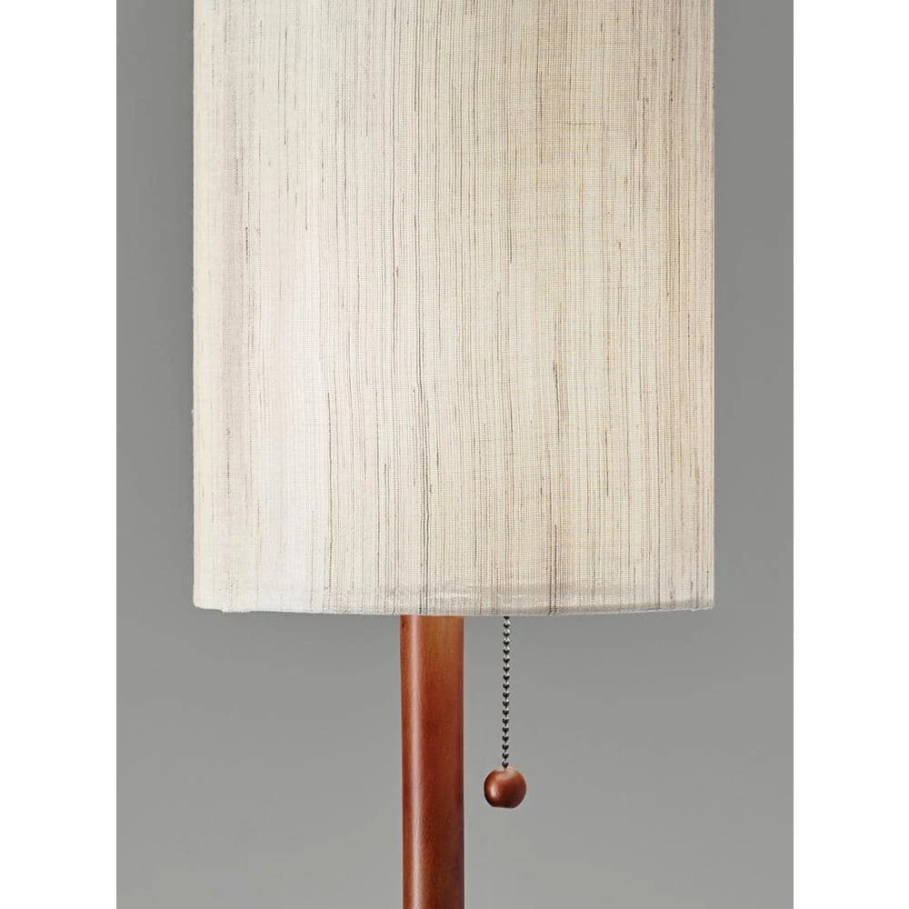 A photograph doesn’t do this lamp justice. Blending modern simplicity and elegance with a walnut finish and a beautifully textured double shade that gives a warm light to any room. A wood-ball accented pull chain switch adds to the charm of this lamp. 31 in. H.