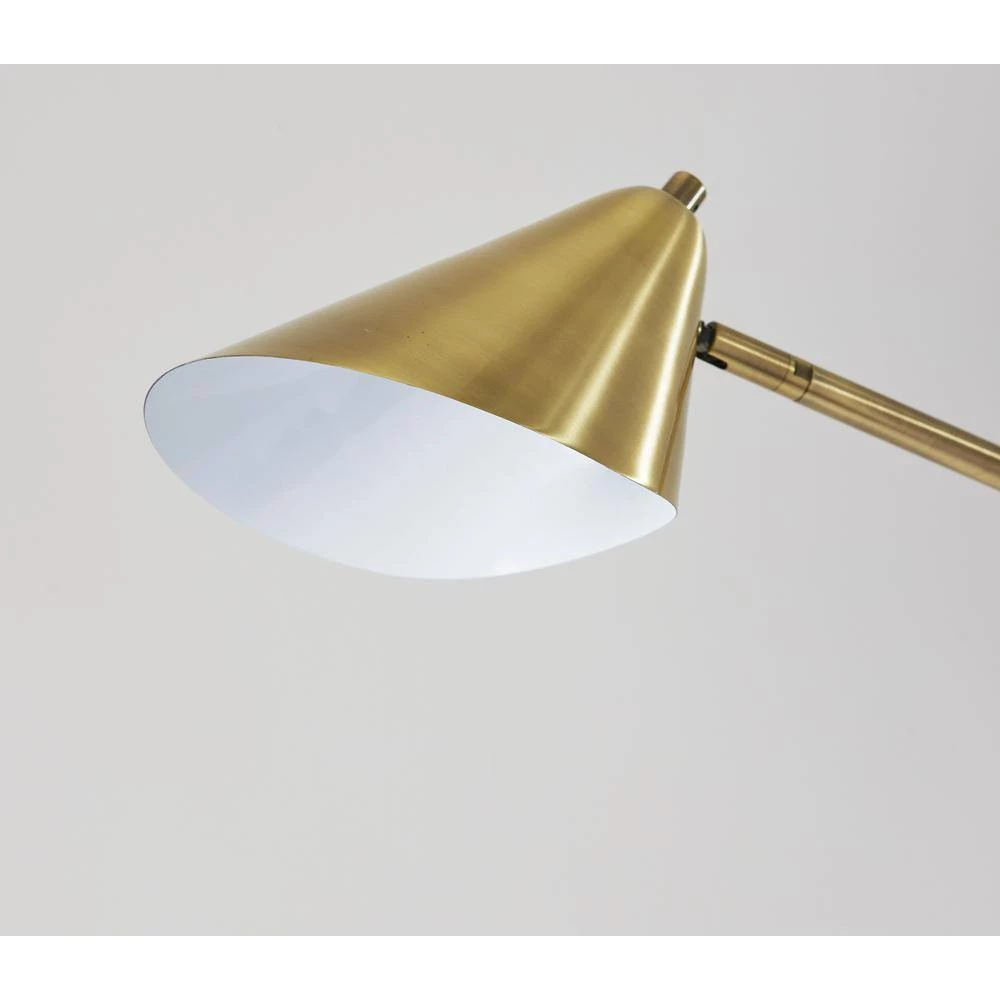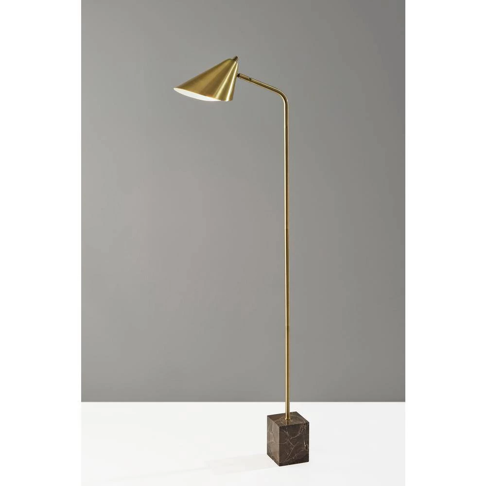 Bring mid-century modern style to your space with the Hawthorne floor lamp. Featuring a chunky cube-shaped base made of brown marble anchoring an antique brass pedestal and shade, this lamp is both sleek and refined and at 55 in. tall and a mere 17 in. D, it is compact enough to be used in any area. It offers an articulation point at the joint of the curved cone-shaped shade, allowing you to direct the light wherever it’s needed. Operated by a rotary switch on the shade to easily turn the 40-Watt bulb (not included) on or off, this lamp also features a 5 ft. clear cord. Complete your space’s look with the coordinating Hawthorne desk lamp and Hawthorne tree lamp.