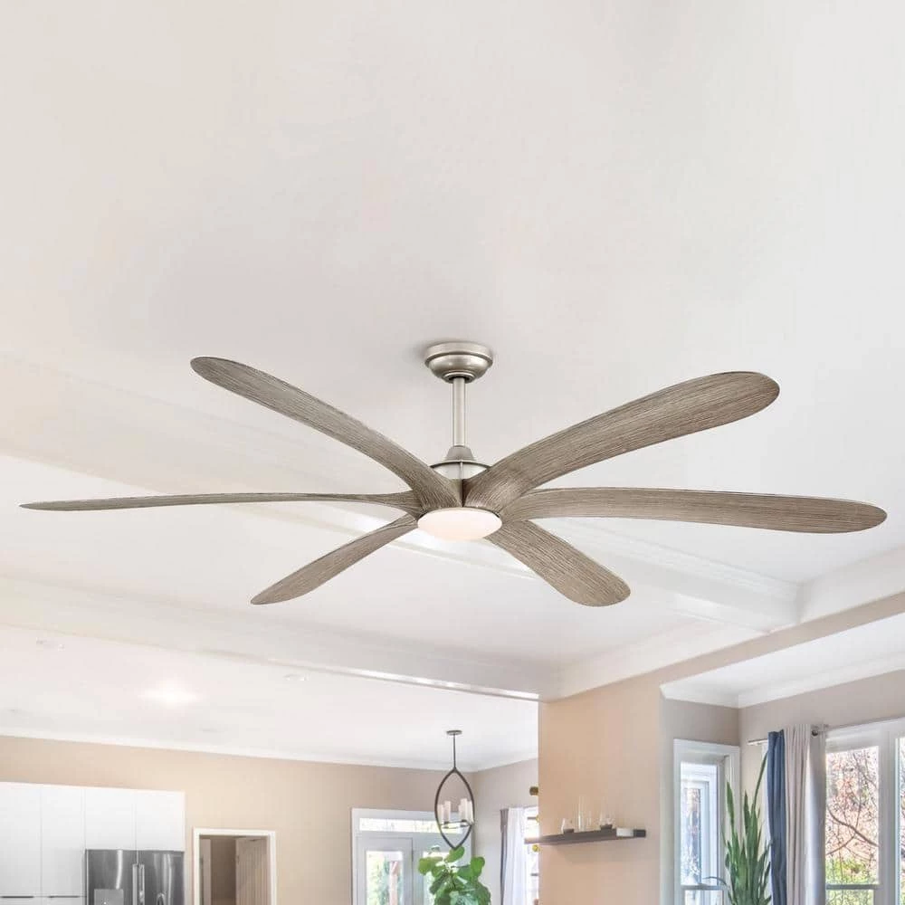 This 72 in. integrated LED nickel ceiling fan with light and remote control is great for large areas or lofts. The powerful DC motor can cool a large room. The dome style light kit with opal glass is a modern fashion design, definitely will become a great conversation-piece of your house.