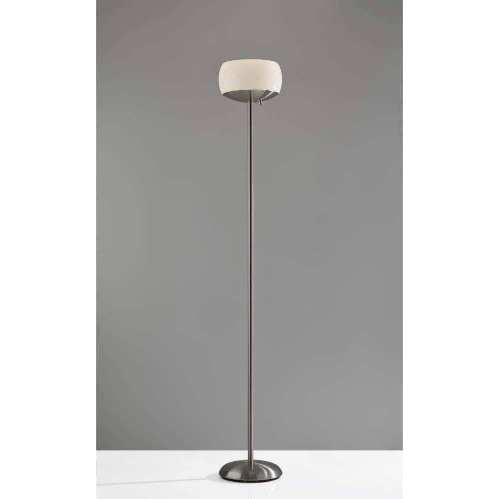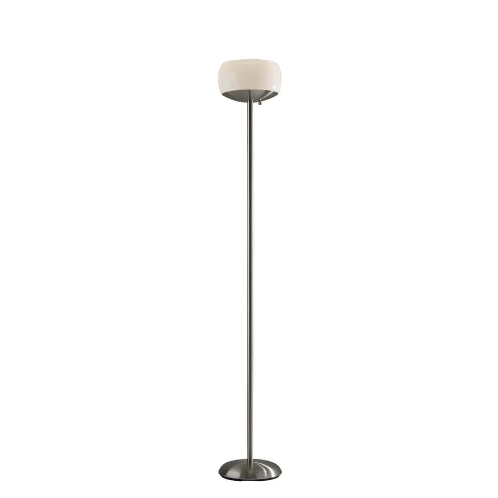 An elegant, yet modern look that is perfect for the office or living room, the Jessica 300-Watt Torchiere takes your space to the next level. A milky white glass houses 2-bulbs for maximum light output. A simple rotary switch is located on a dome shaped base turning the lamp on and off. Made up of brushed steel finished metal, this lamp exudes sleek, modern style. This lamp provides bright ambient lighting for large living spaces. An Adesso patented 300-Watt Double Socket construction allows for 2 crisscrossed sockets, each holding on/off 150-Watt incandescent or LED bulbs which provides approximately 3 times more light than a typical torchiere. A High/Low rotary socket switch is located on the socket. Note: Adesso bulb recommendations: use incandescent bulbs up to 150-Watt or dimmable LED bulbs (Do not use: 3-way bulbs or CFL’s). Bulbs are not included.
