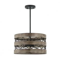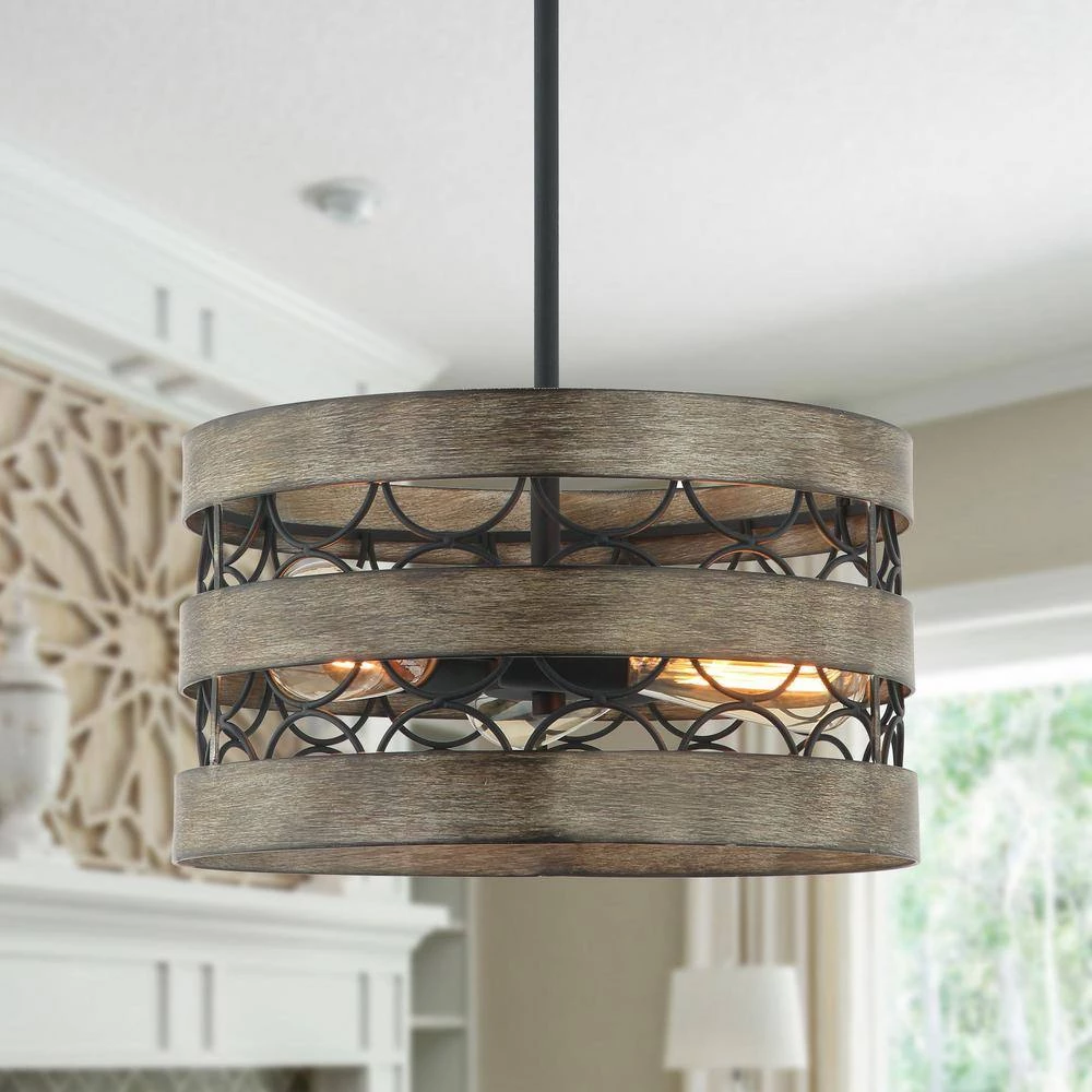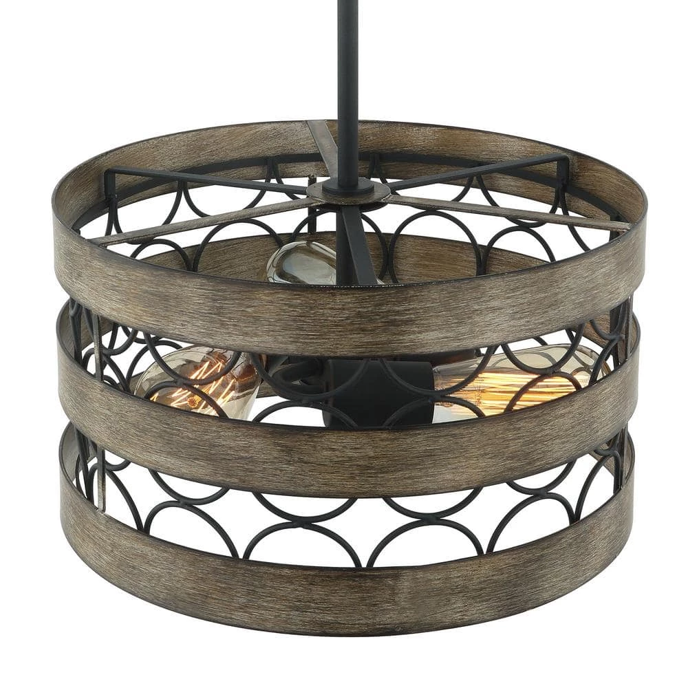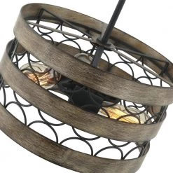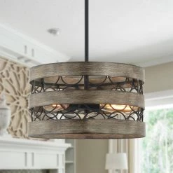 This 3-light drum pendant makes the perfect statement anywhere in your home, from the living room to the entryway. Its metal frame is wrapped with 3 circle in brushed wood finish designed to make resemble wood. Inner metal bars and black 4 semicircles details hold the shade together, which allow its 3 lights to peek through, offer a boost of brightness and rustic touch.