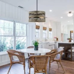 - Farmhouse rustic chandelier creates unique wood-like texture and classic openwork drum silhouette for an eye-catching appeal