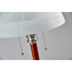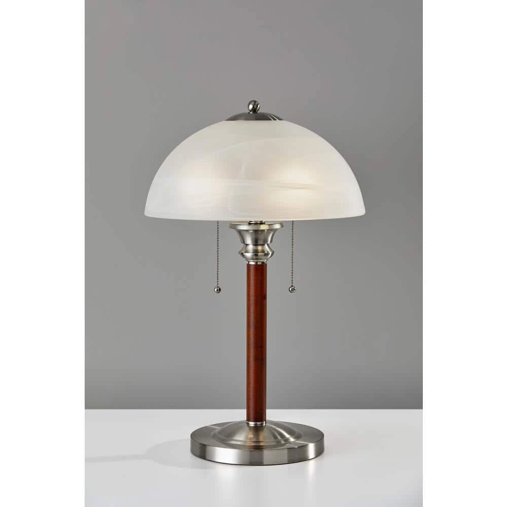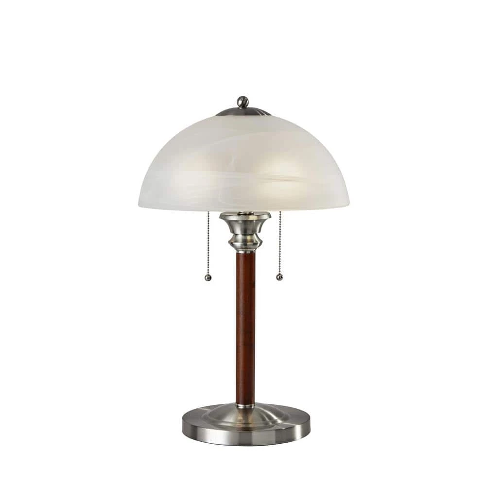 The Lexington Table Lamp is a stately piece that has a walnut wood body with satin steel accents and base. It has a fine alabaster frosted glass shade that is anchored by a satin steel cap with matching finial. The 2 sockets each have ball-accented pull chain, 22.5 in. H.