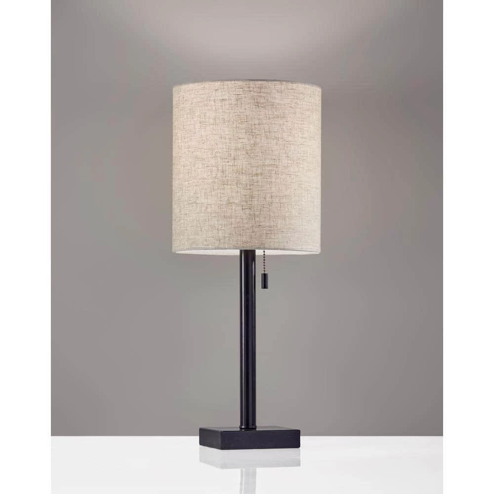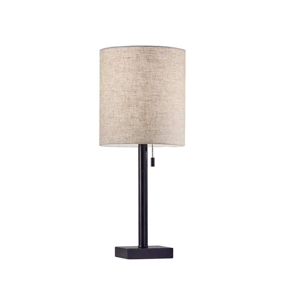A thick dark bronze finished metal pole supports a natural textured fabric shade. A tall cylinder shade is contrasted by a compact square shaped metal base. A simple pull chain turns the lamp on and off. Set this table lamp on your nightstand for a soft, transitional look.