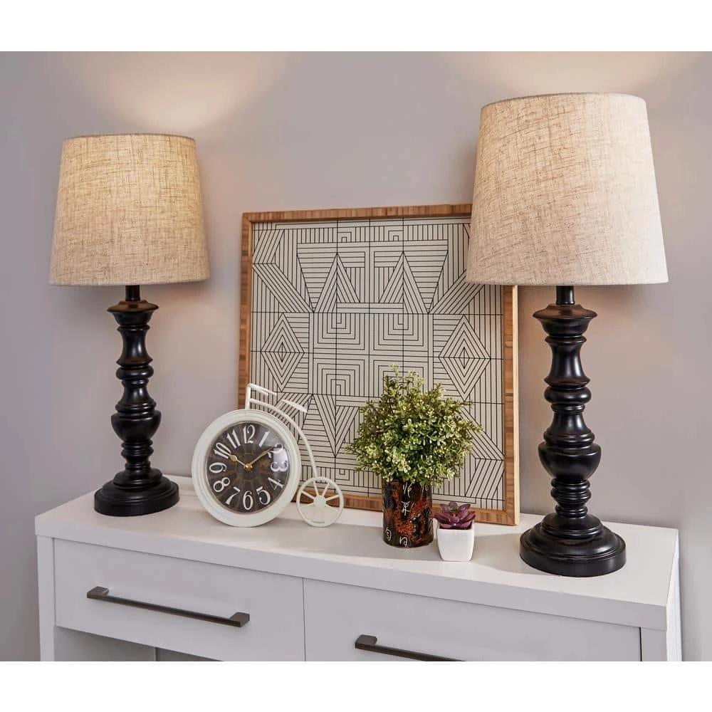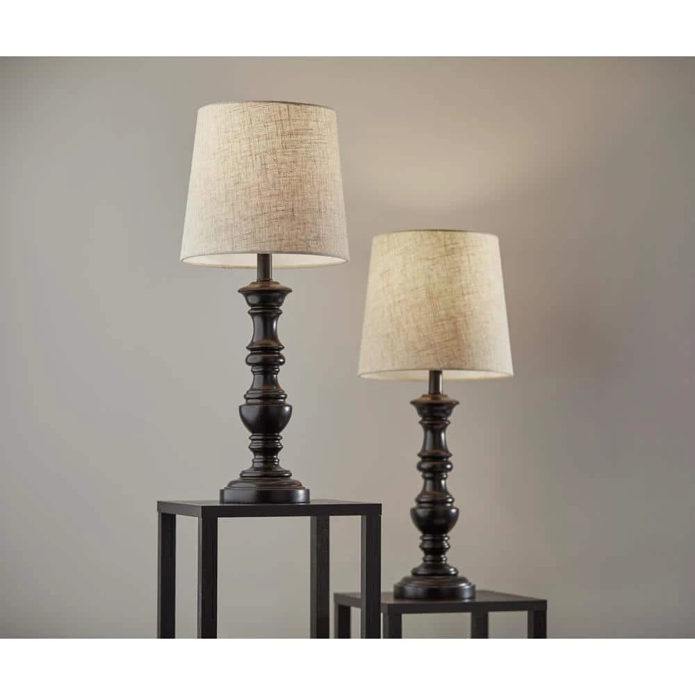 The perfect addition to your console table or for offering some warm, ambient lighting to your bedside tables, this pair of table lamps is a classy addition to any room in the home. A beautiful beige textured fabric shade sits atop an antique brass metal tapered base. A short modified drum shape of the shade comprises a more modern silhouette than most. Turn the lamps on and off with a convenient switch on the socket. All Adesso lighting product is either UL or ETL listed, meaning that it has been tested and approved to meet the government-regulated safety standards for the USA. Bulb is not included.
