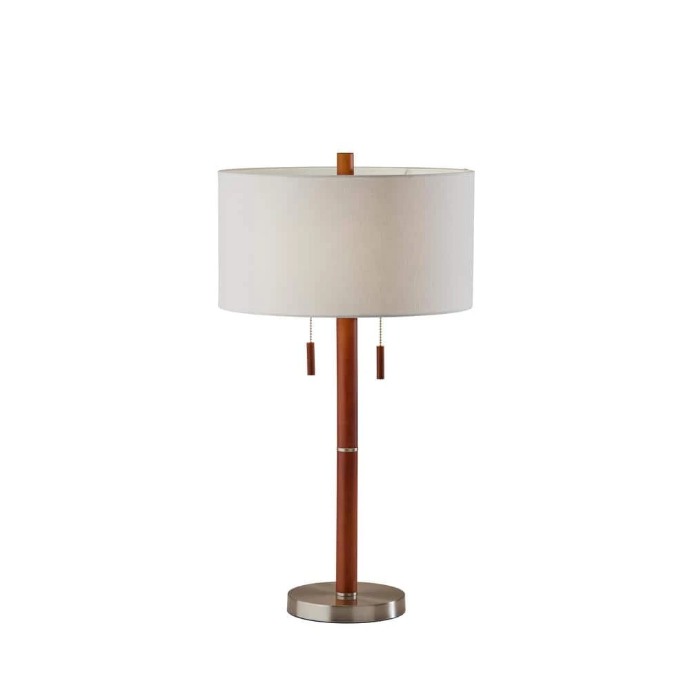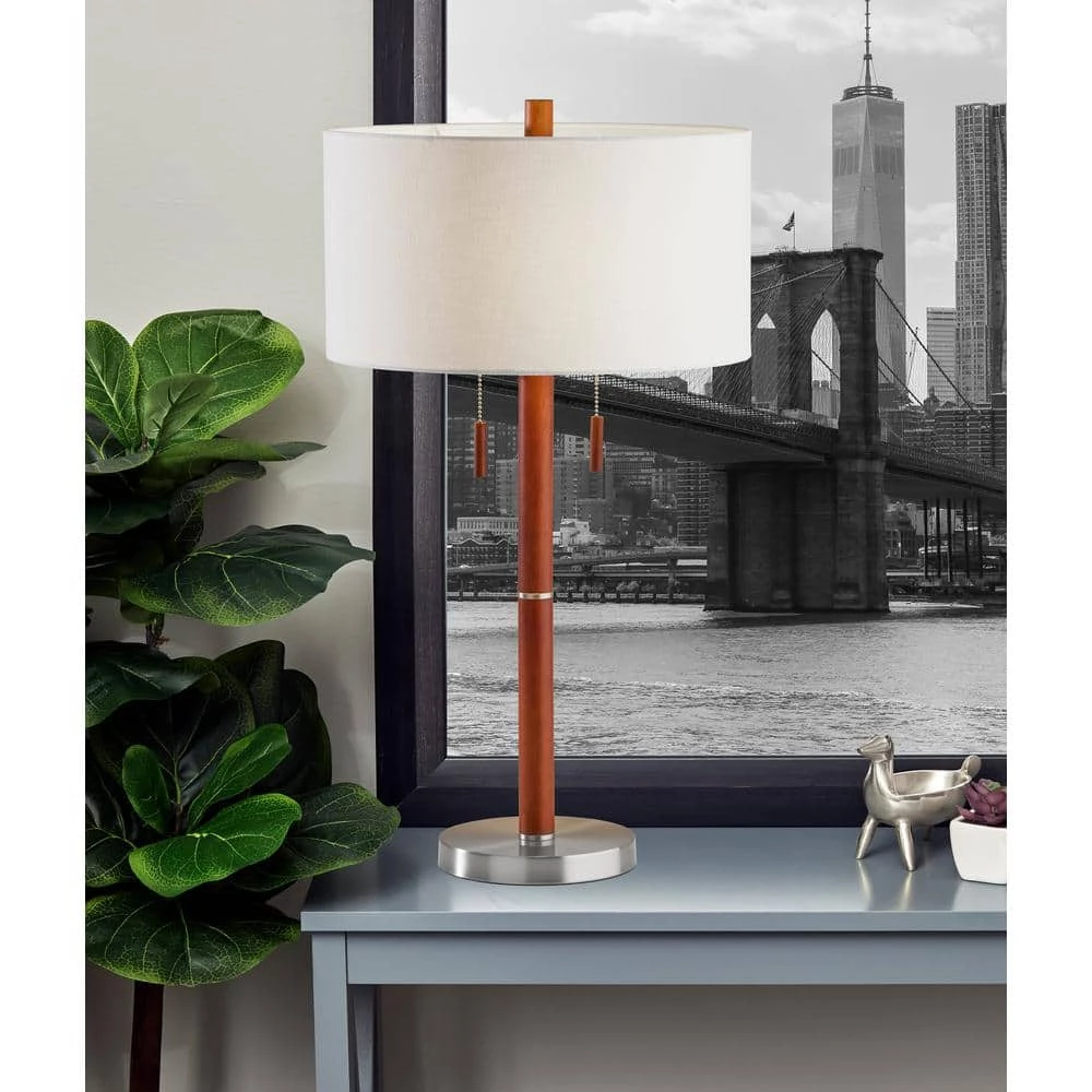 An essential addition to your home decor, this 28 in. tall table lamp’s body strikes a streamlined silhouette. It has a long walnut rubberwood stem featuring brushed steel metal accents and a sturdy round steel base. The Madeline table lamp’s crisp, off-white textured fabric drum shade ensconces two 100-Watt bulbs (not included) to disperse light softly throughout your space, making it a stylish addition to your bedroom, work space, living area and more. Powered by a 5 ft. L clear cord, this lamp is easily turned on or off with dual rubberwood pull chains. Pair it with the Madeline floor lamp to complete your space’s decor.