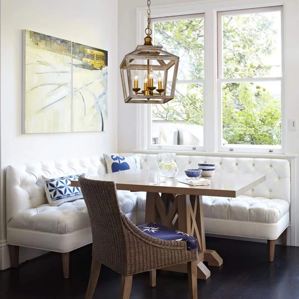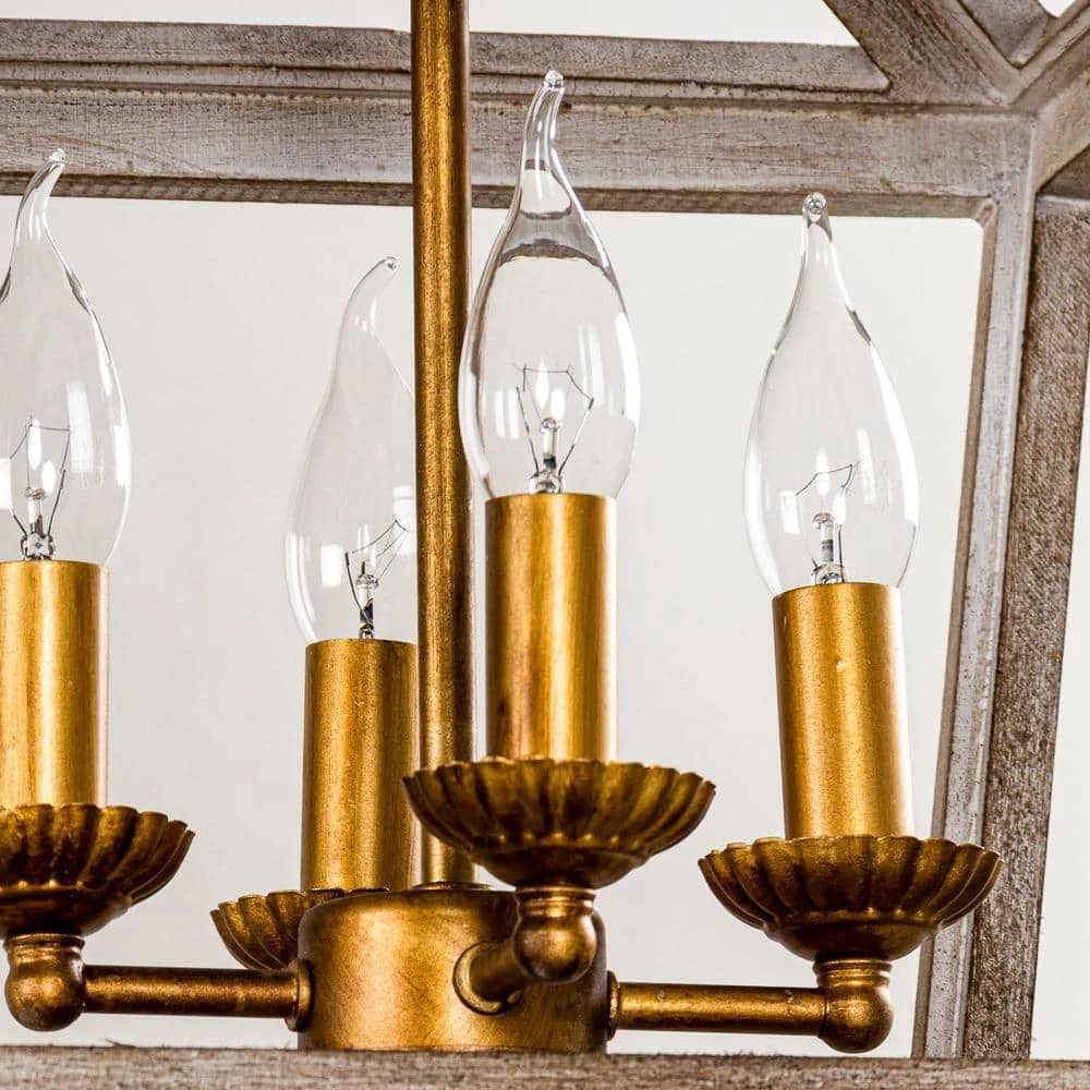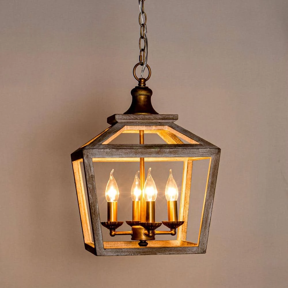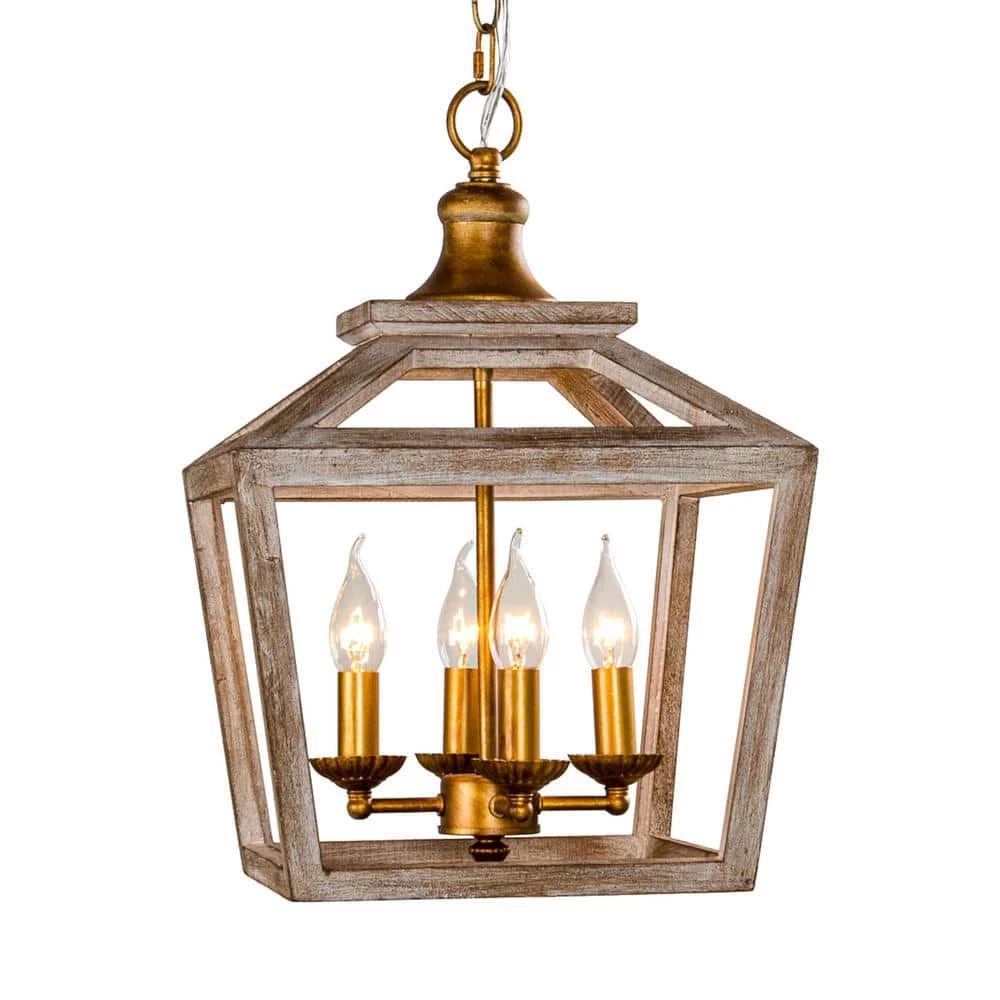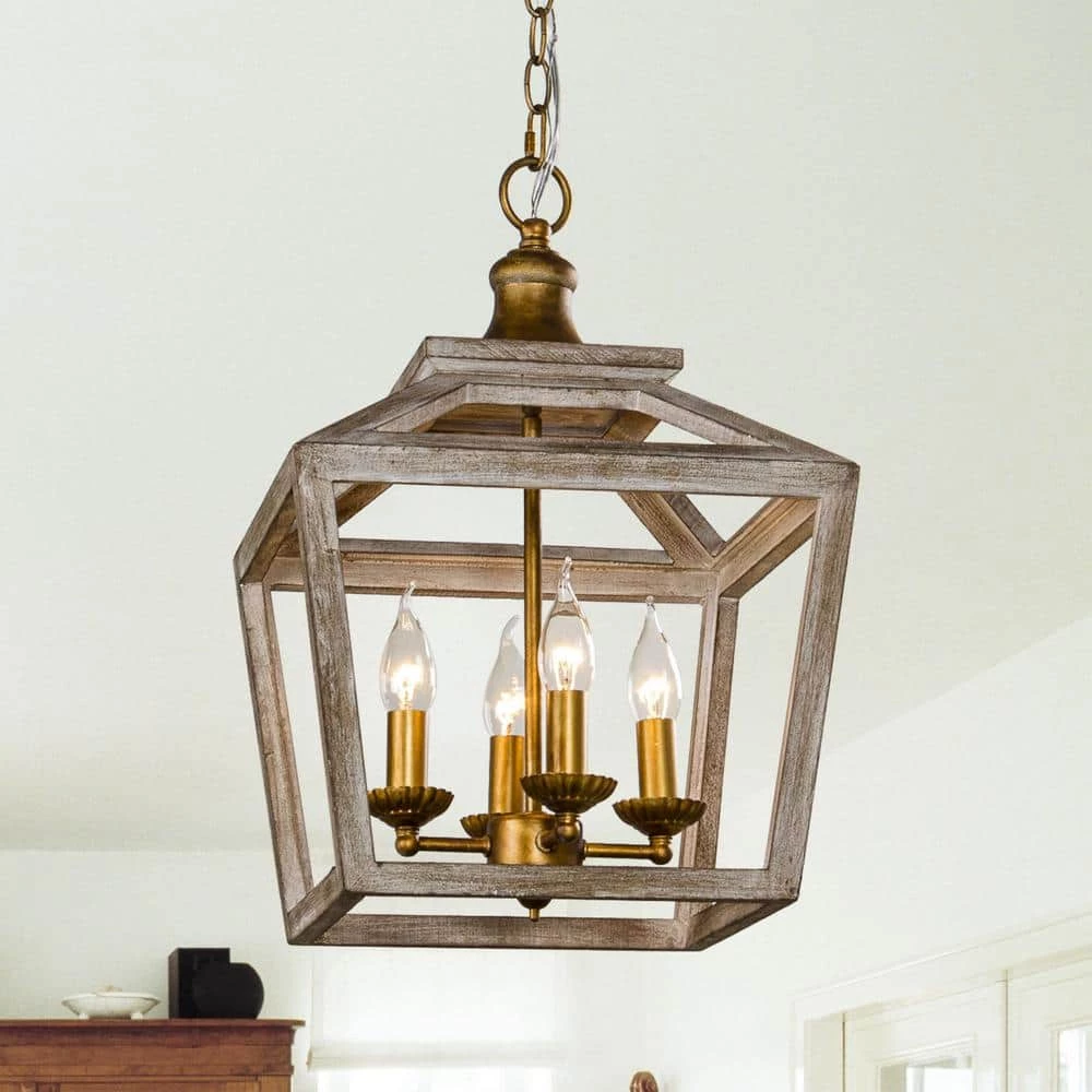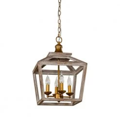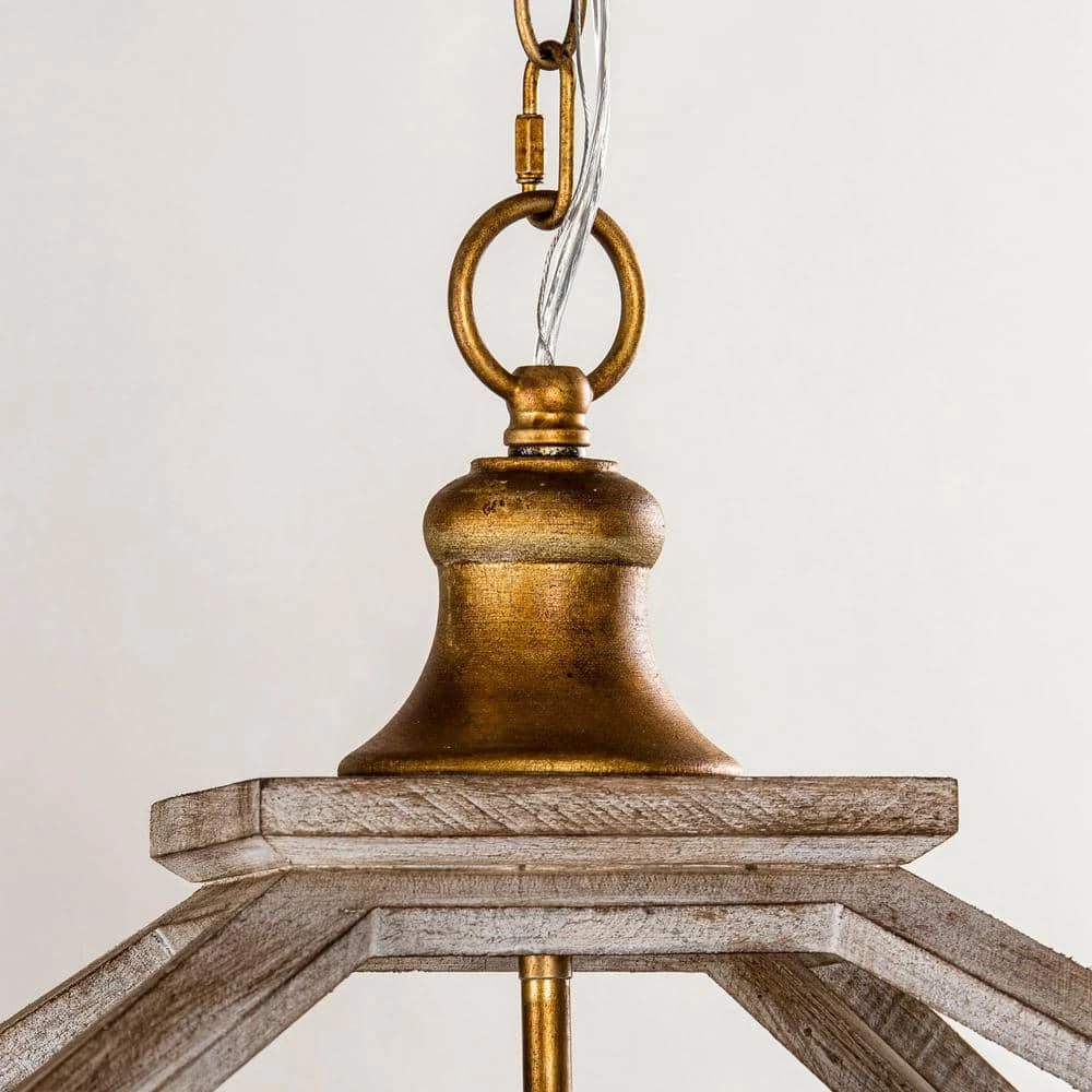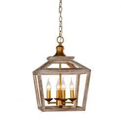 Bring a natural atmosphere to your space with this farmhouse 3-Light antique lantern wood chandelier, made of solid wood and sturdy metal through anti-corrosion treatment. The gold metal frame with grain putty sanded down and weathered wood lantern adds coastal charm, the open lantern shape in antique white brown finish also ensures maximum illumination. This farmhouse industrial chandelier matches home decorations with natural elements, bringing a strong sense of design and farmhouse industrial styles to space.