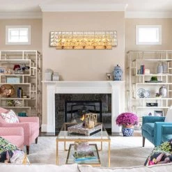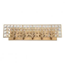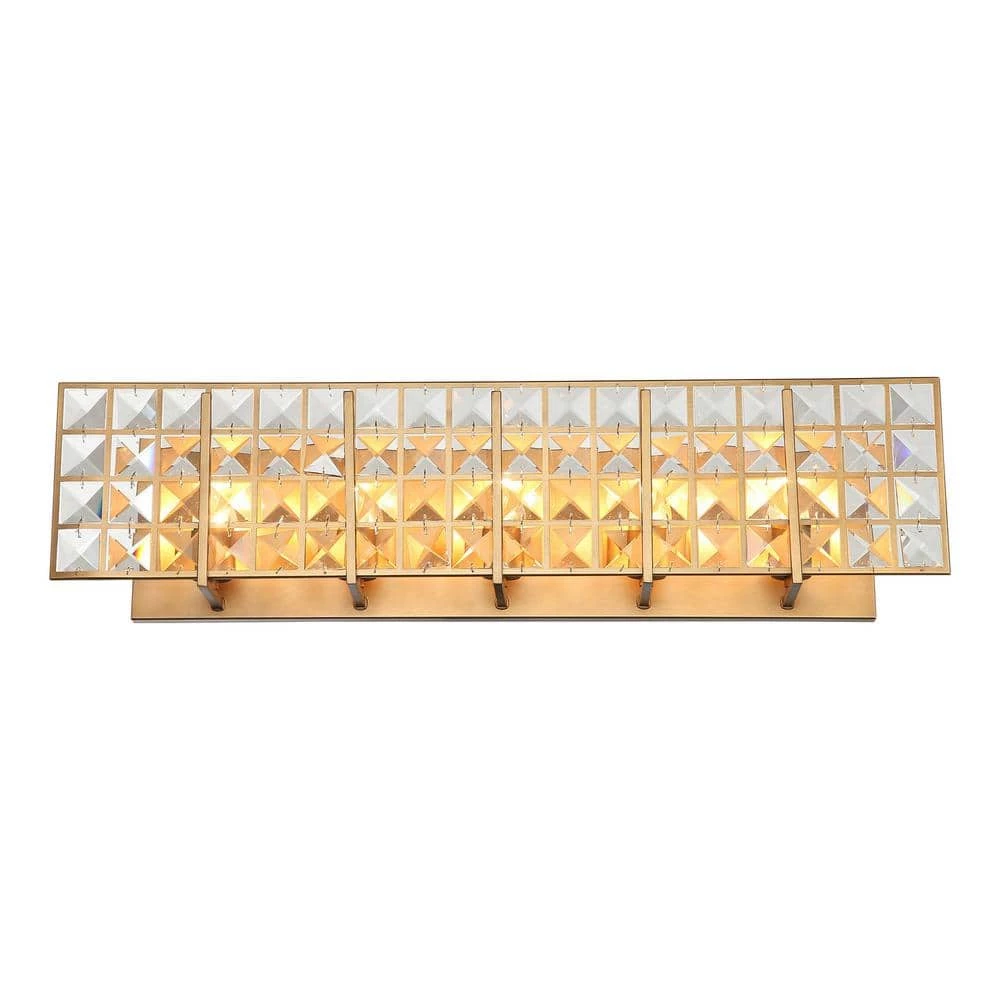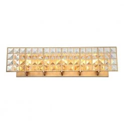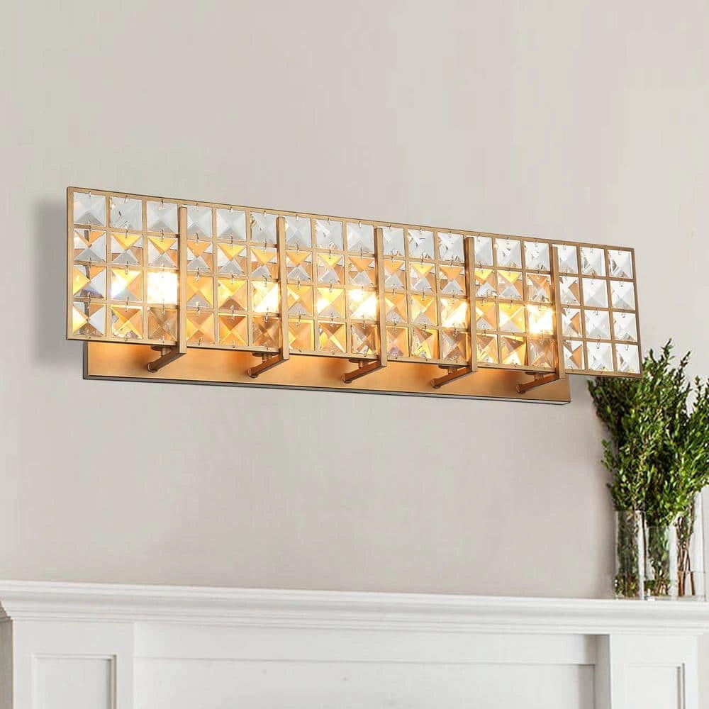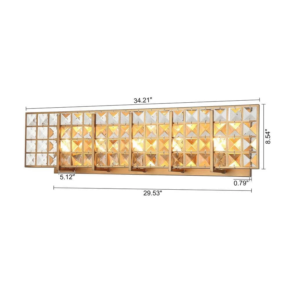 This 5-Light 34.21 in. wall sconce light with crystal shade is made by high quality metal with plating process in gold finish, more durable. 1 rectangle shaped lampshades in 6 parts made by some dozens of crystal beads and exude a elegance and sparkling beauty and its beautiful transparent crystal curtain shimmers every second as the light passes through. The hardwired is easy to install and use it, while you light the bulb up by your home switch, this light would produce more gorgeous spots on the wall, you will be satisfied with how this wall lamp can elevate any room to a luxurious and charming world.