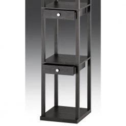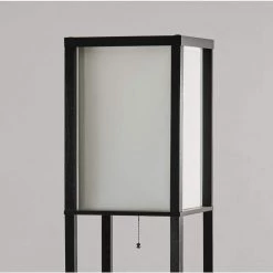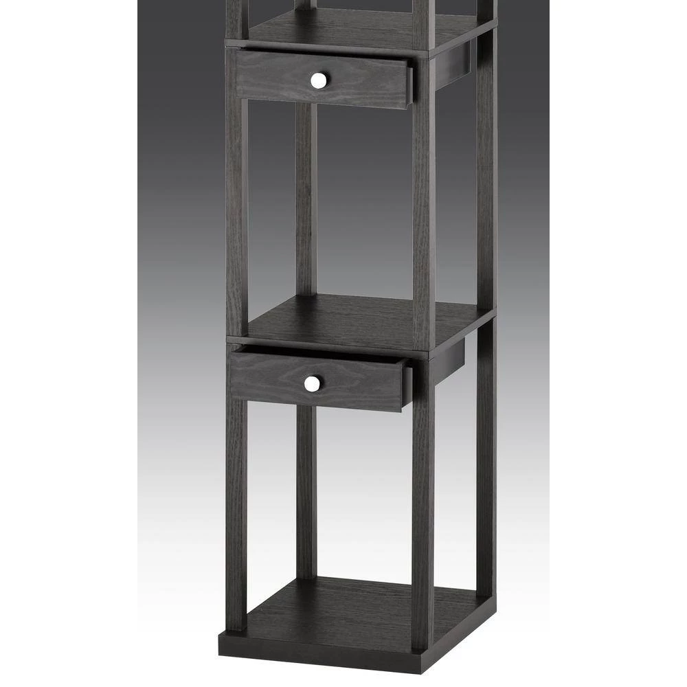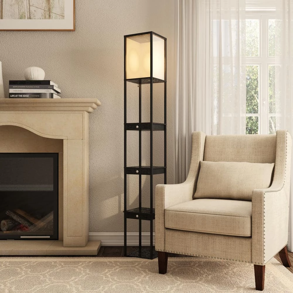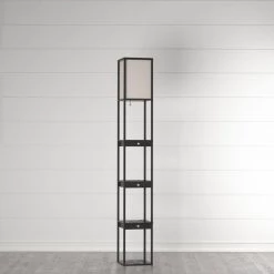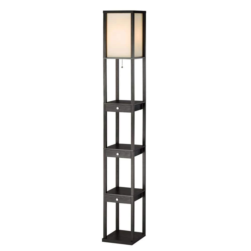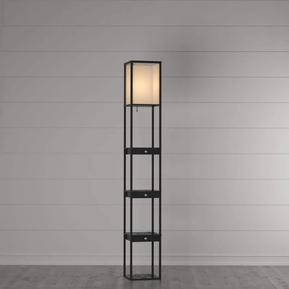 The Murray three-drawer shelf lamp functions overtime delivering three storage drawers while displaying trinkets and illuminating a room. And it does it all with a fashionable black MDF frame and off-white cotton shade easily suited for contemporary or transitional decors. A brushed steel pull chain switch turns the lamp on and off. This lamp has a clear cord and is smart outlet compatible. Bulb is not included.