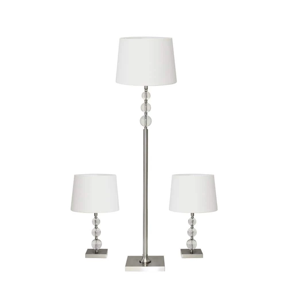 This classic lamp set with a brushed steel finish and acrylic orbs will make the perfect addition to your home. It comes with two table lamps and one floor lamp. The lamp set has a nice brushed steel finish with clear acrylic orbs. Atop the base is a textured white linen hardback shade. Each lamp takes a 150-Watt bulb or LED/CFL 3-way equivalent.