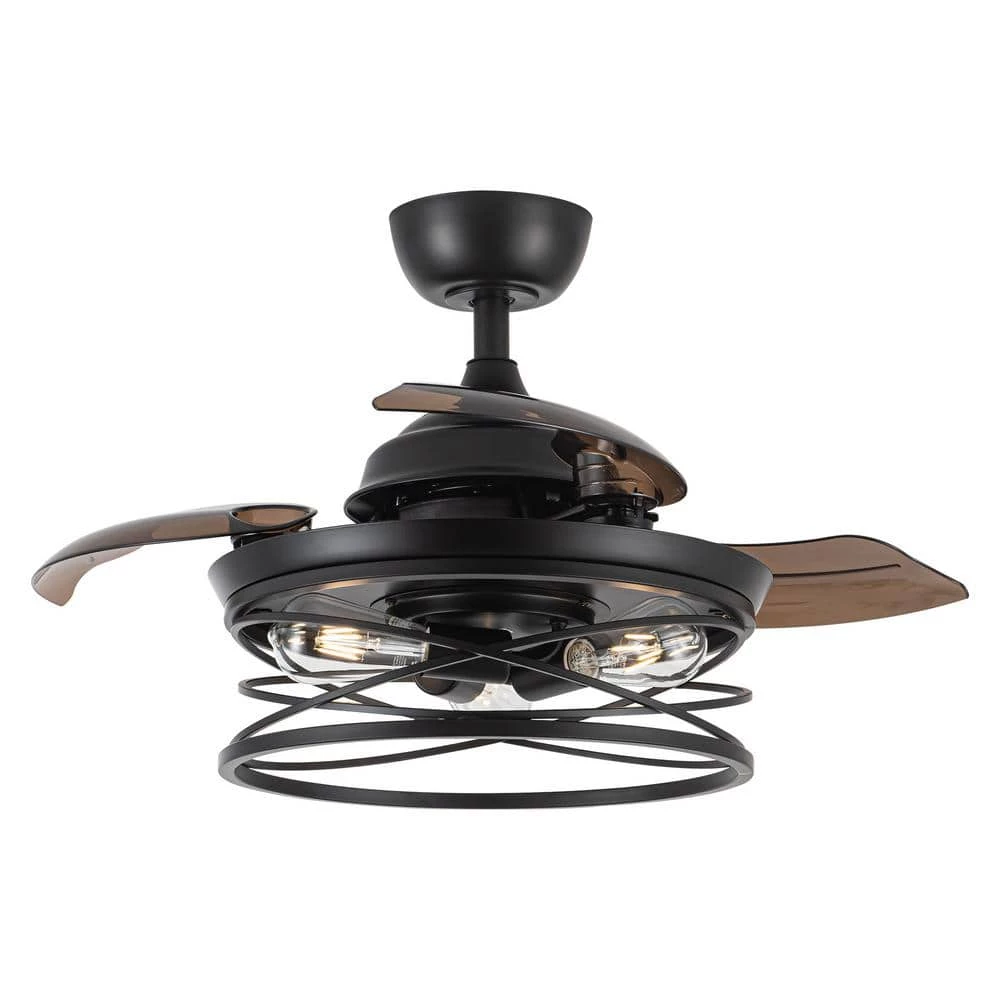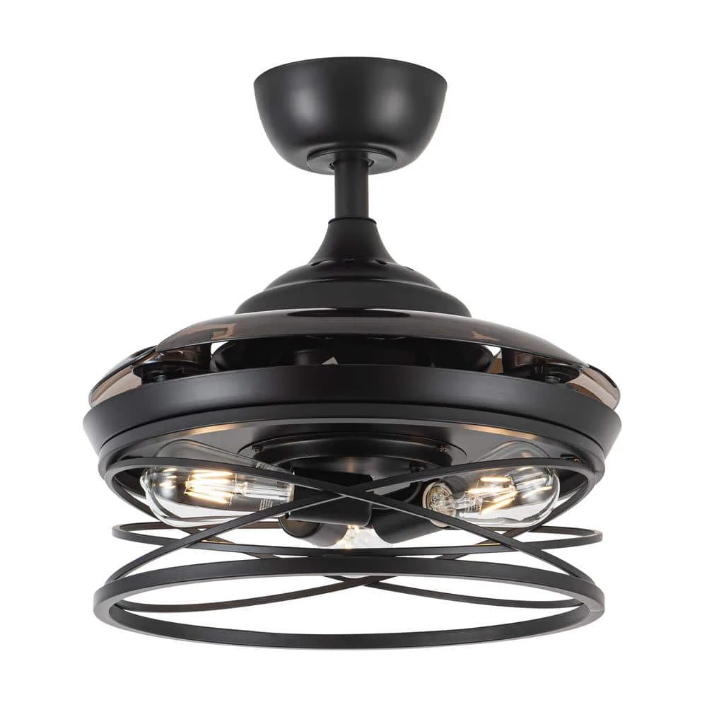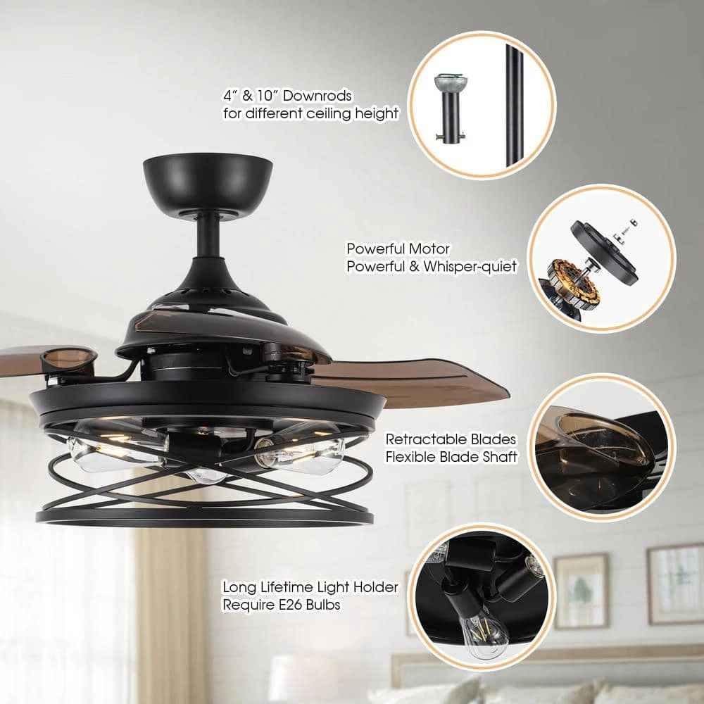 The Petra 36 in. ceiling fan is a combination of an industrial caged semi-flush mount light and a retractable ceiling fan. It offers a industrial feel to your home with its Line iron frame. This fixture requeired 3 light bulbs, edison LED bulbs will add the finishing touch. The motor features 3 speeds works very quite with no noisy, the handy remote control provides independent light operation and speed control.