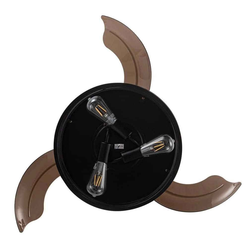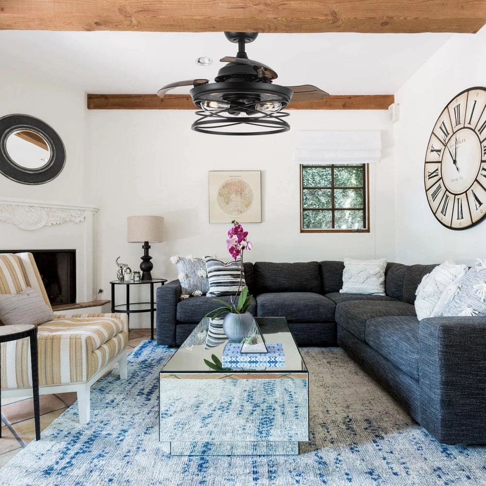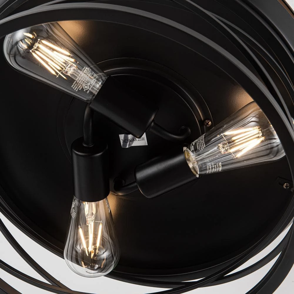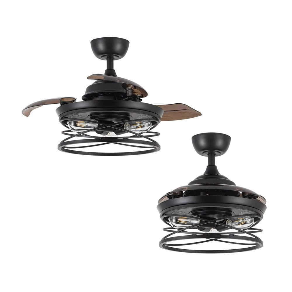 The Petra 36 in. ceiling fan is a combination of an industrial caged semi-flush mount light and a retractable ceiling fan. It offers a industrial feel to your home with its Line iron frame. This fixture requeired 3 light bulbs, edison LED bulbs will add the finishing touch. The motor features 3 speeds works very quite with no noisy, the handy remote control provides independent light operation and speed control.