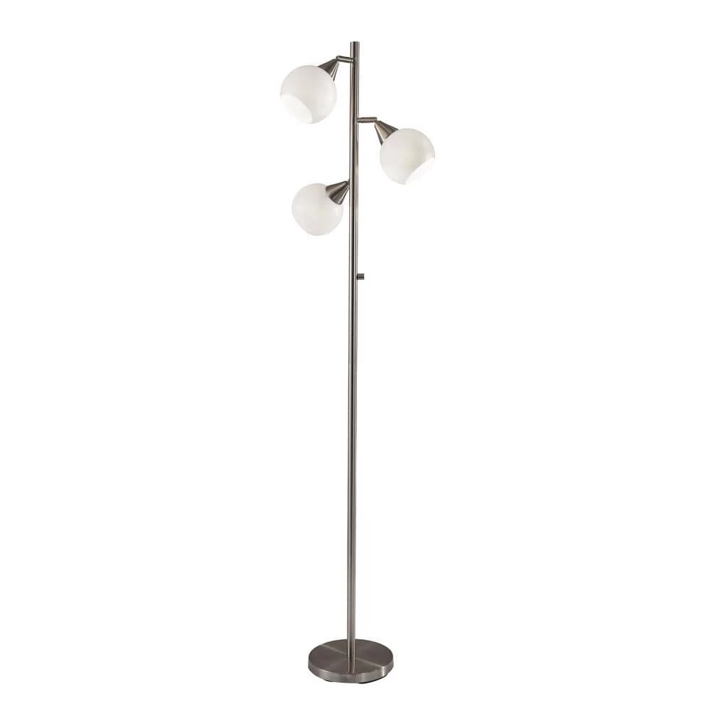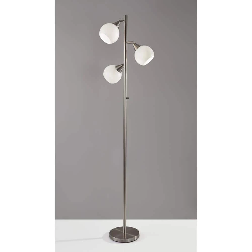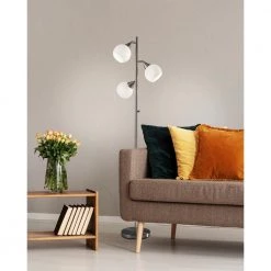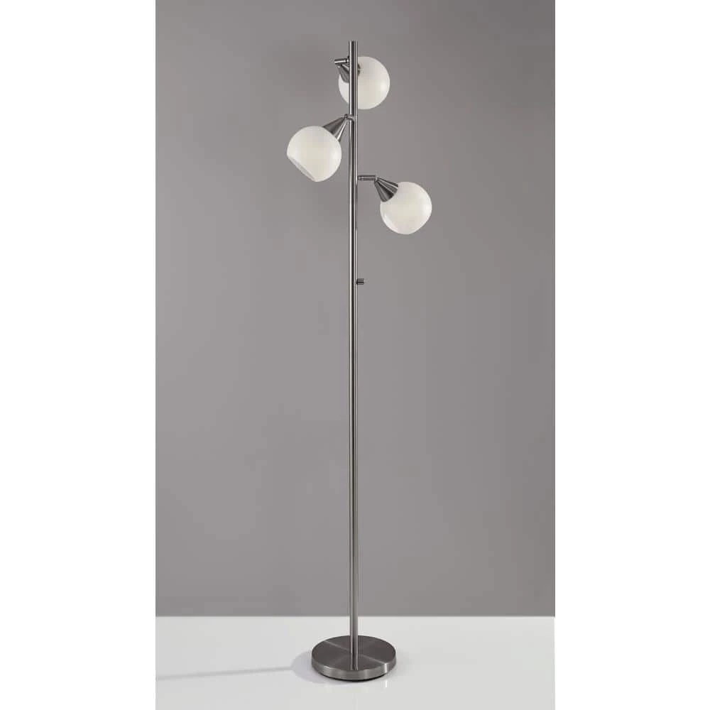 A simple solution for lighting in a bedroom or living room, the Phillips Tree Lamp fits in perfectly with a versatile brushed steel finish and classic style. 3 globe shaped white plastic shades are adjustable in order to direct light wherever it is needed. A 4-way rotary switch located on the pole has the following settings: 1-light on, 2-lights on, all lights on, off. allowing the user to select the amount of light that suits their needs.