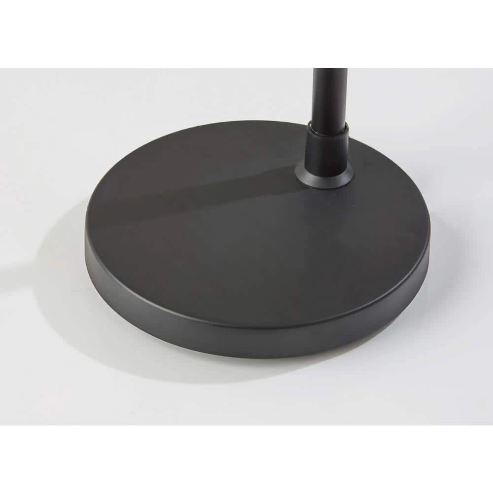 - Lamp base and pole are a black metal construction that matches the shade’s finish