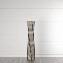 - Twisted black metal tower with thin black cane sticks